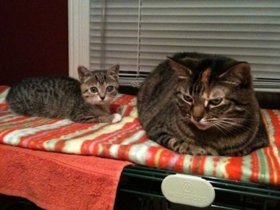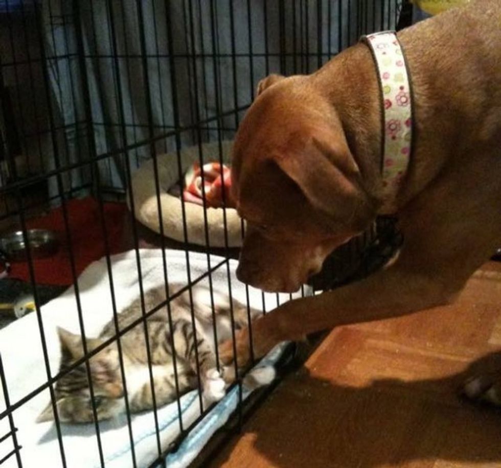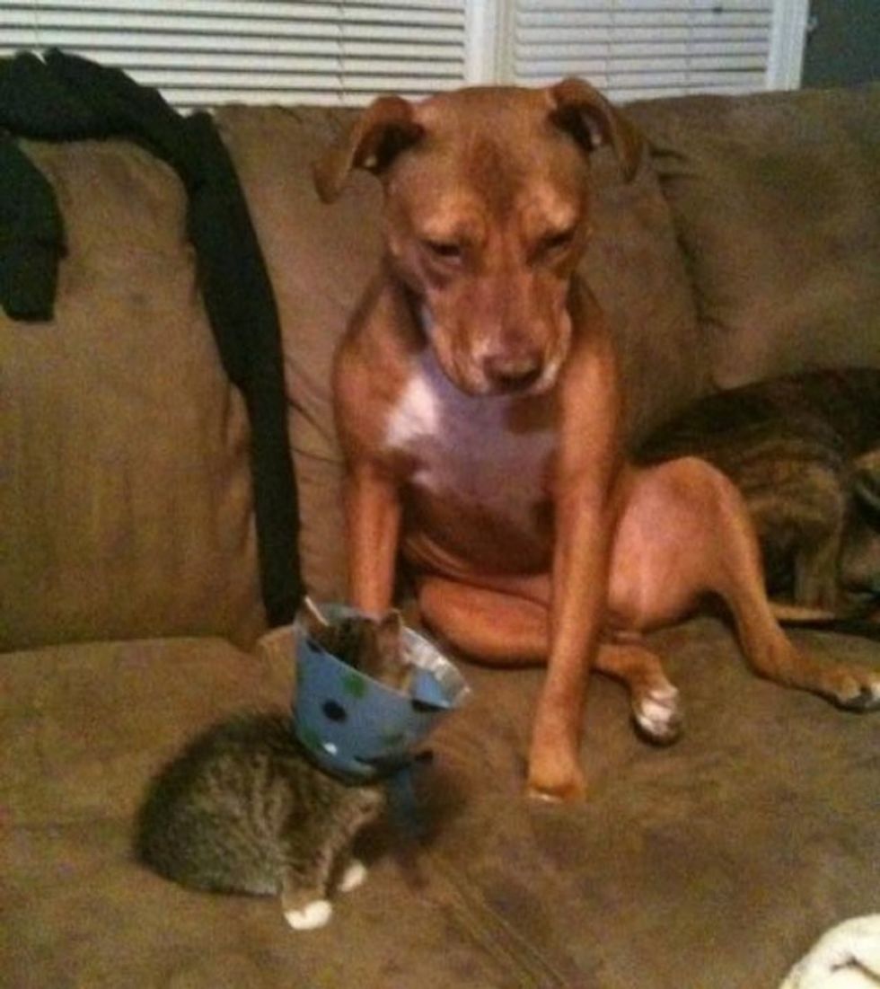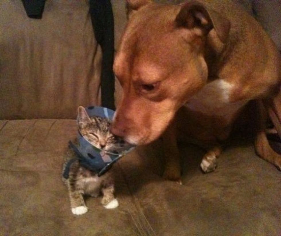 After the surgery, Sadie was very concerned and came to give her kitten some comfort and love.