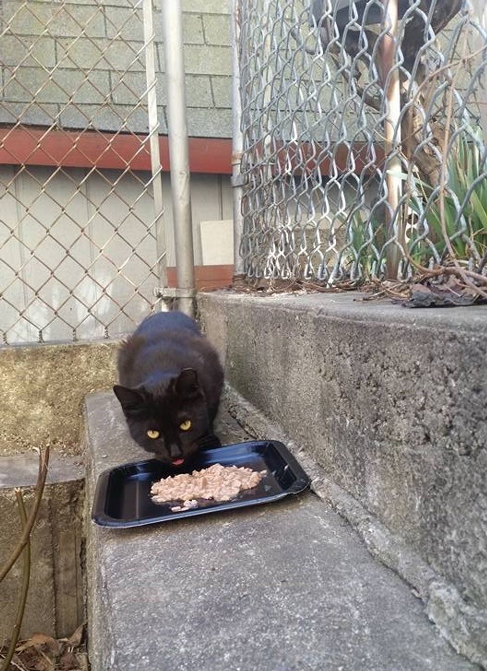 It became their daily routine where Onxy would wait for Paul at meal time, getting ready to feast. Over the next few months, the kitty began to warm up to her caregiver and started to entertain the idea of entering the house through the street level basement.