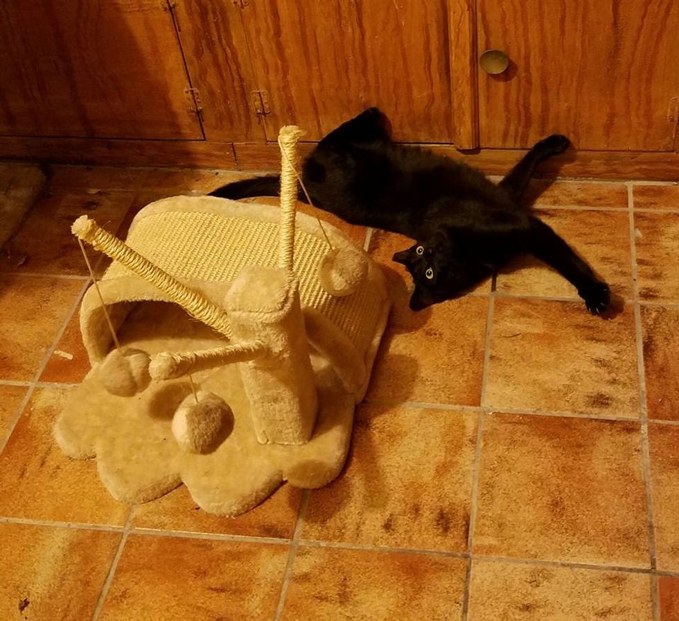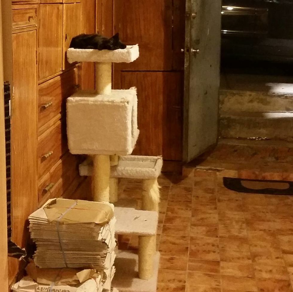 There was an old cat condo in the basement that Paul had planned to remove, but little Onyx decided to claim it. So it was there to stay. "It was pretty torn up but I kept it for Onyx as she loved it and it kept her in the basement longer and longer."