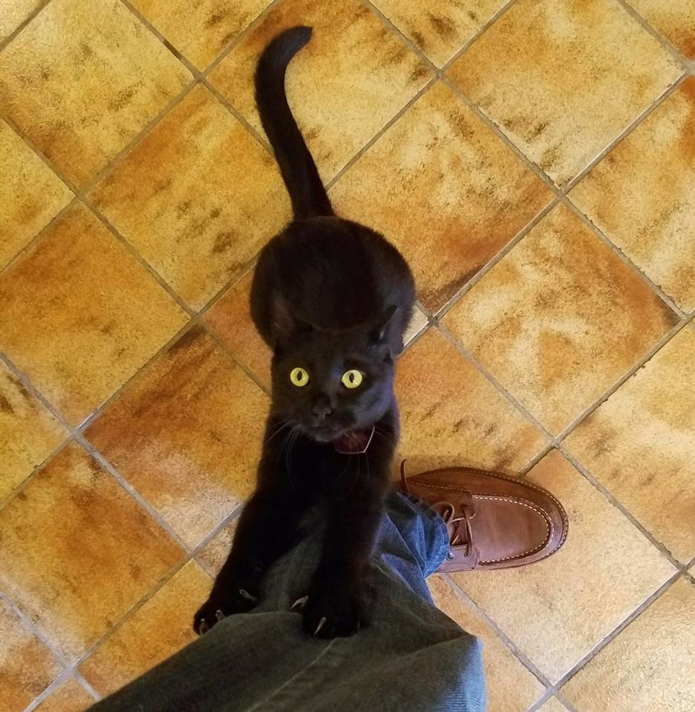 "From feral to perched on my shoulder… I love my Baby Onyx aka Lil Sleek."