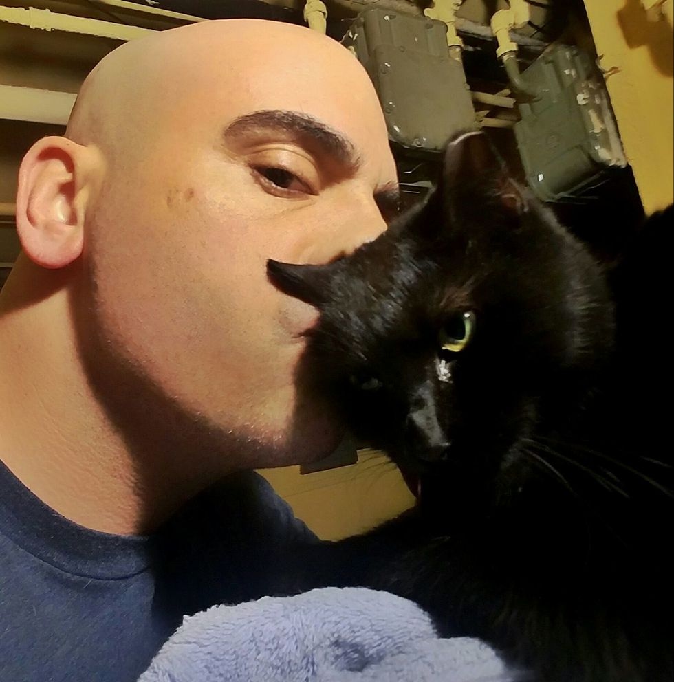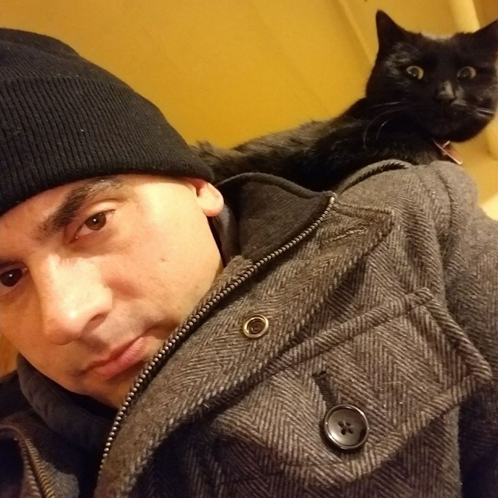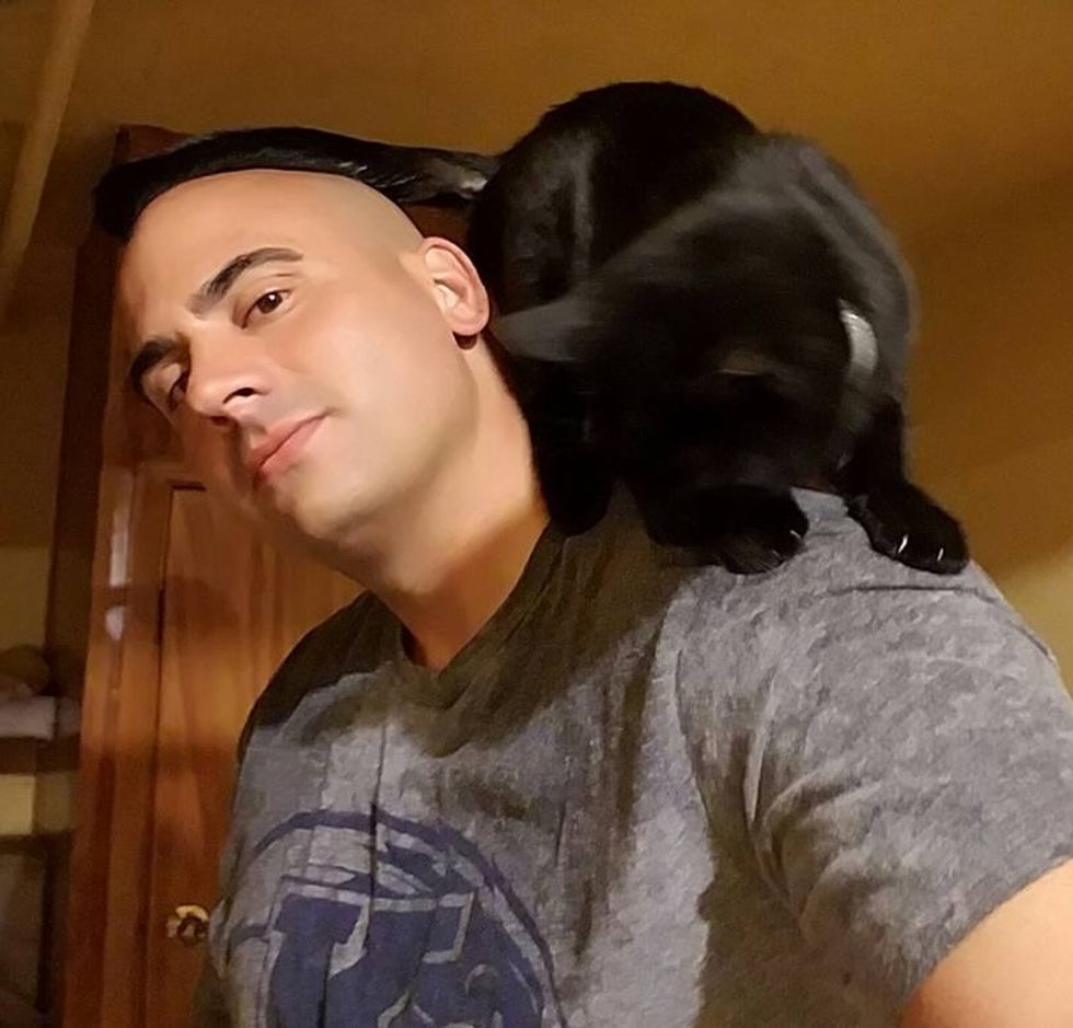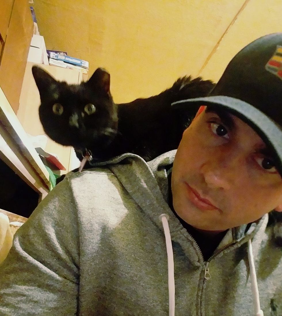 Onyx loves to perch on her Cat Dad's shoulder for a ride around the house.