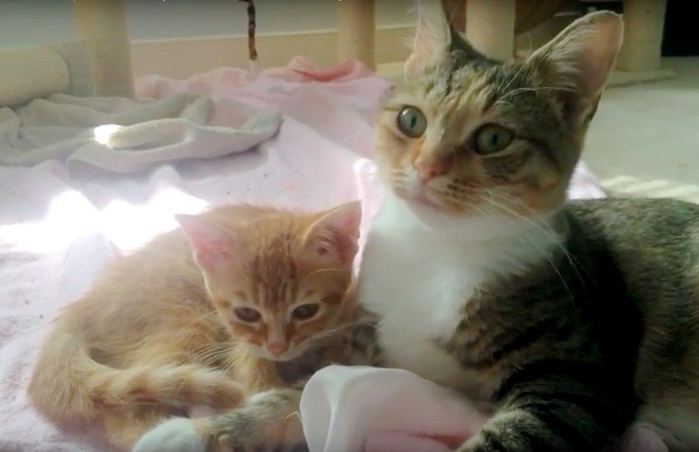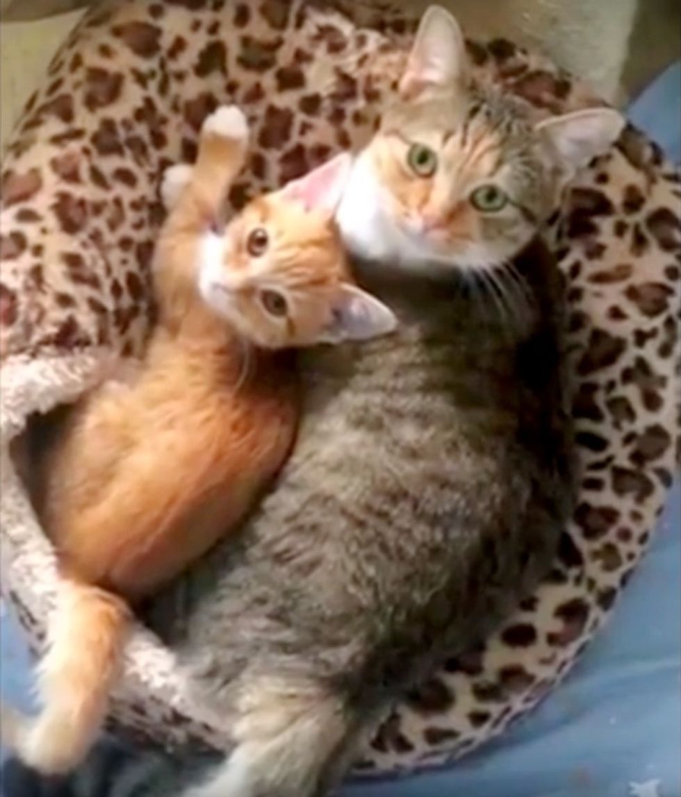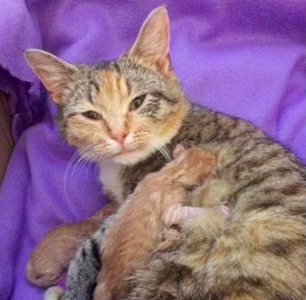 A feral cat was saved just in time so her babies could live. Now she can't stop cuddling her tiniest kitten.
