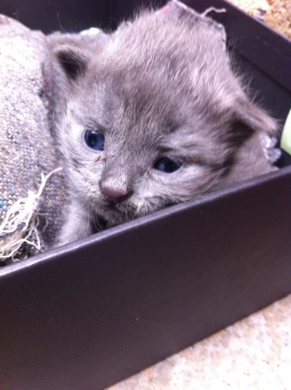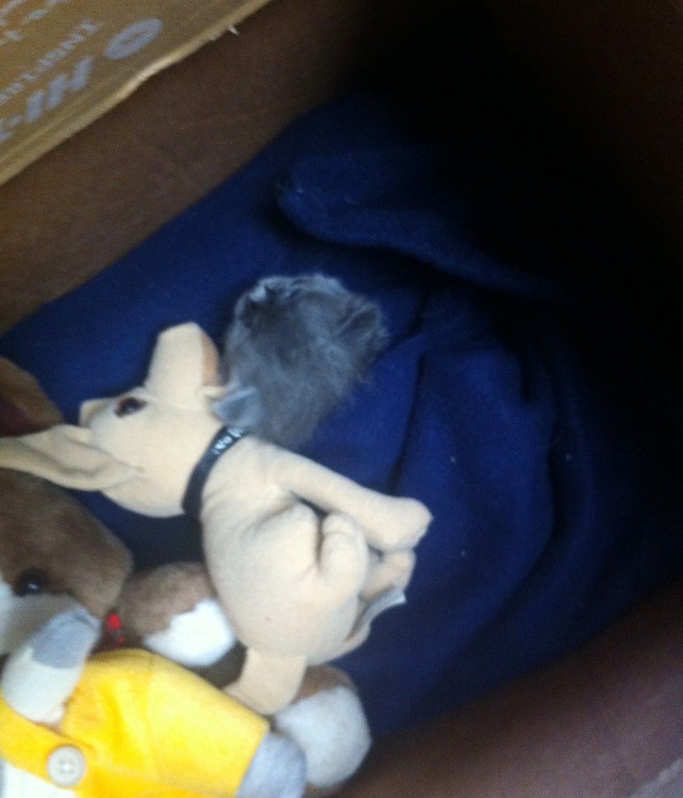 They put the kitten in a box full of blankets with warm water bottles and stuffed toys around, so he could have something to cuddle up with.