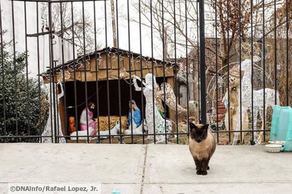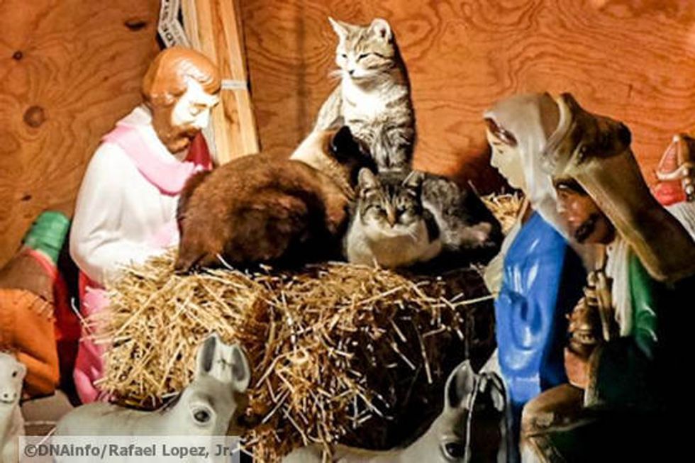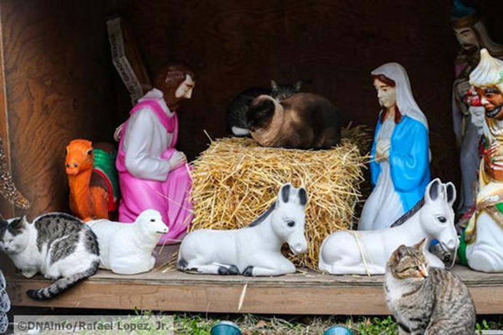A colony of feral cats from Brooklyn find cozy refuge in a Christmas Nativity Scene and bring delight to the neighbors. Annette and Sue, two sisters, have placed the nativity scene in a lot next to their home for almost a decade.