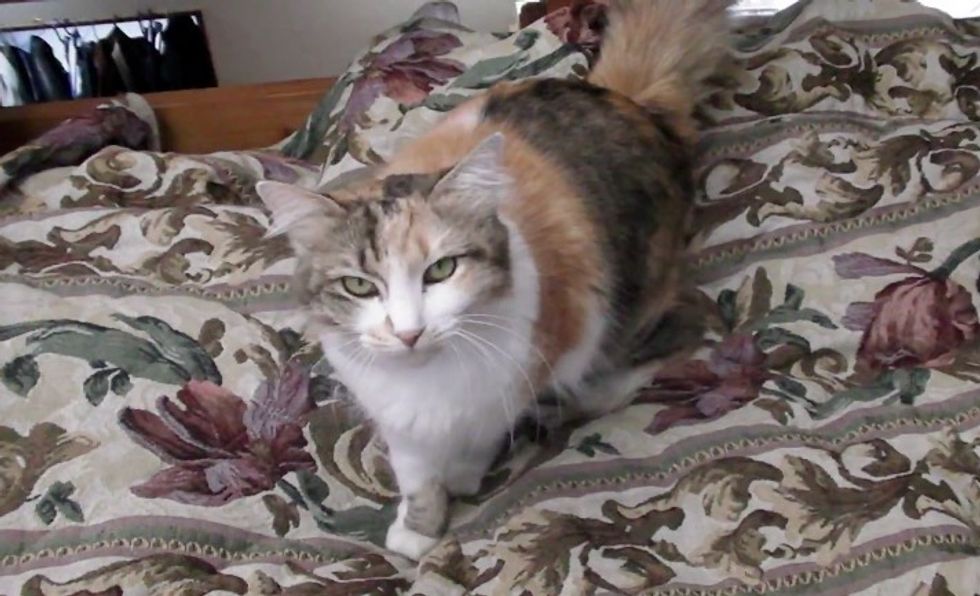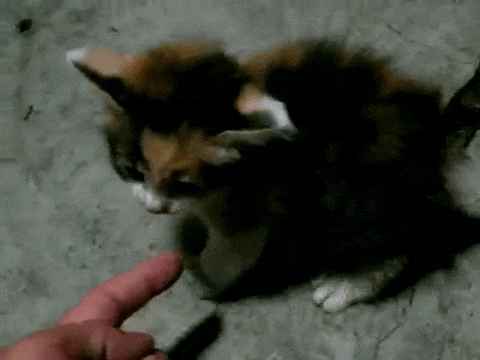 When the kitten stopped hissing, he offered his hand, hoping she would let him pet her. Then the most beautiful thing happened... The tiny calico turned to the side, signaling that she was ok to be touched.