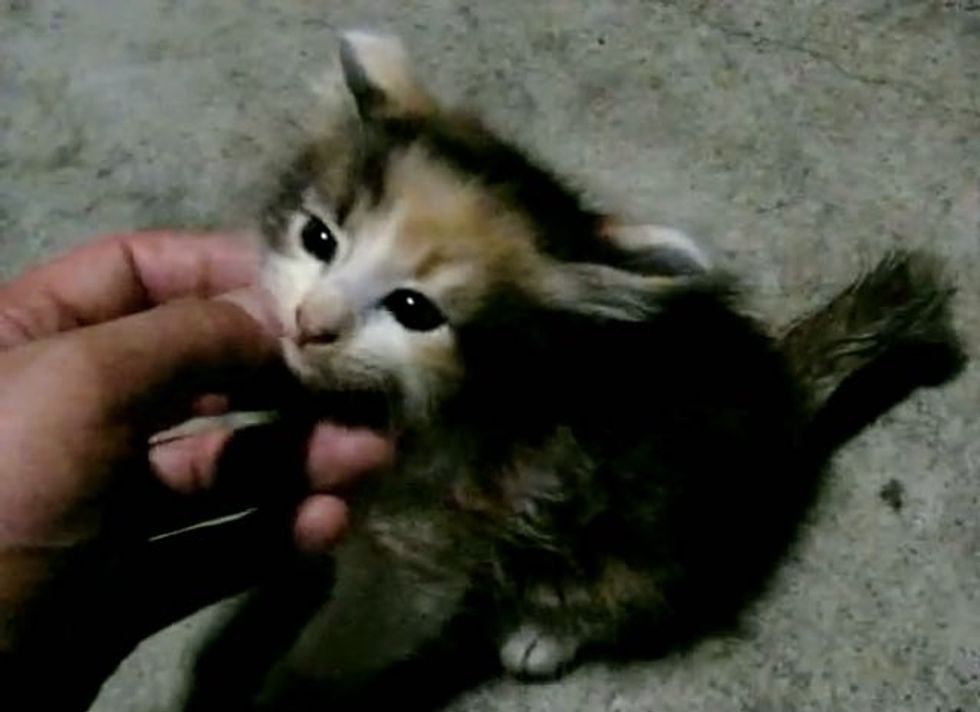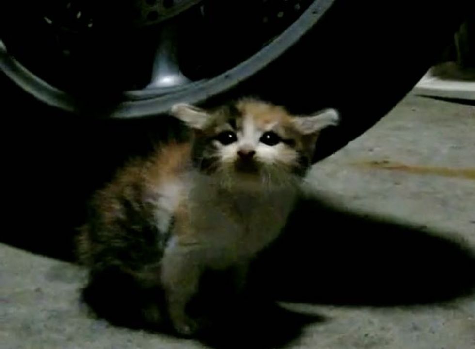 It was a rainy day at 2am in the morning in Japan. A man heard meowing coming from the parking garage on the lower level. He went down and traced the crying. When he saw a tiny calico kitten standing behind a motorcycle, he got down to her level and tried to soothe the very frightened little kitten.