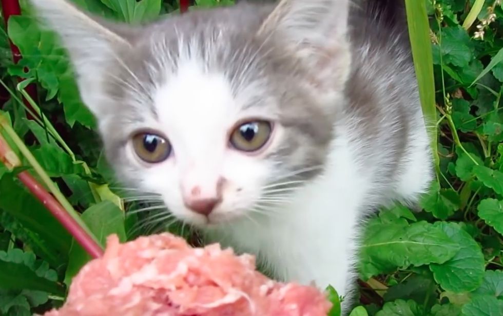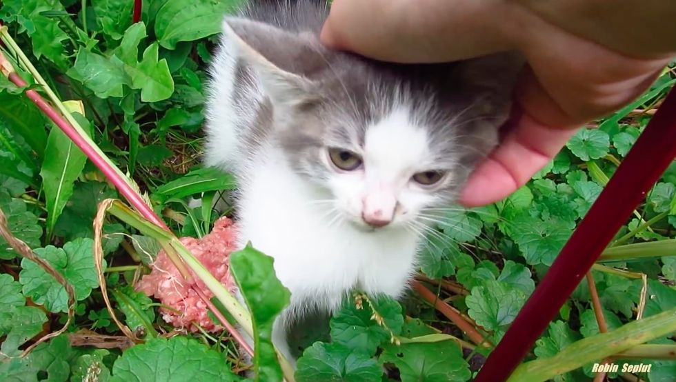 Robin gave the kitten some time to calm down before handing him the food. After a few sniffs, things began to change.