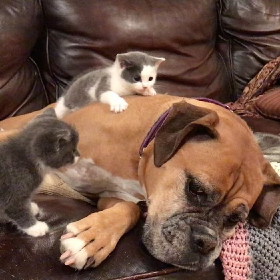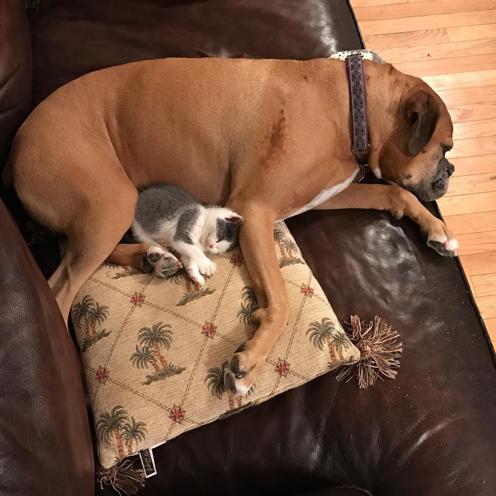 The two teeny sisters are getting some snuggles from their canine mama Suzie.
