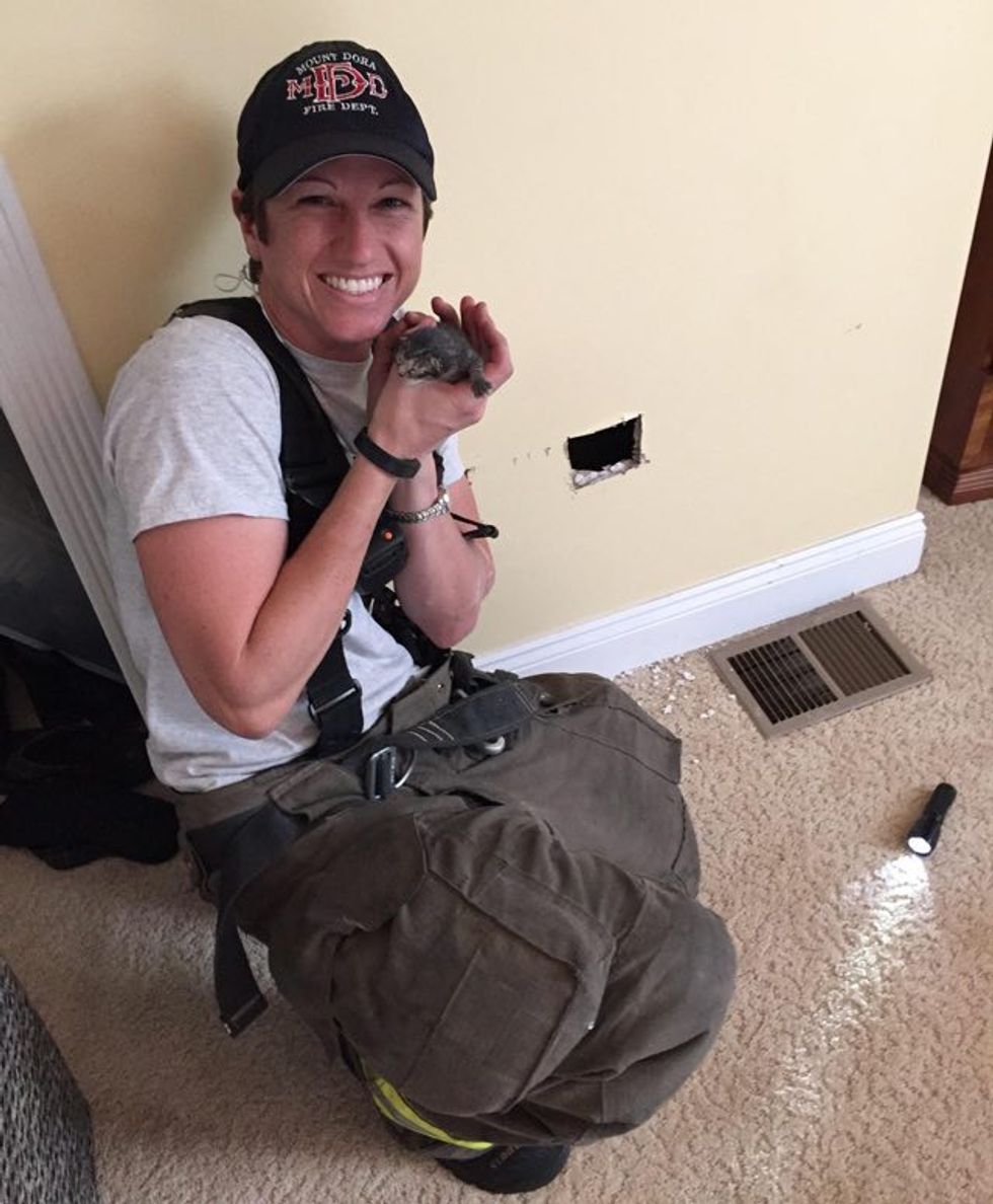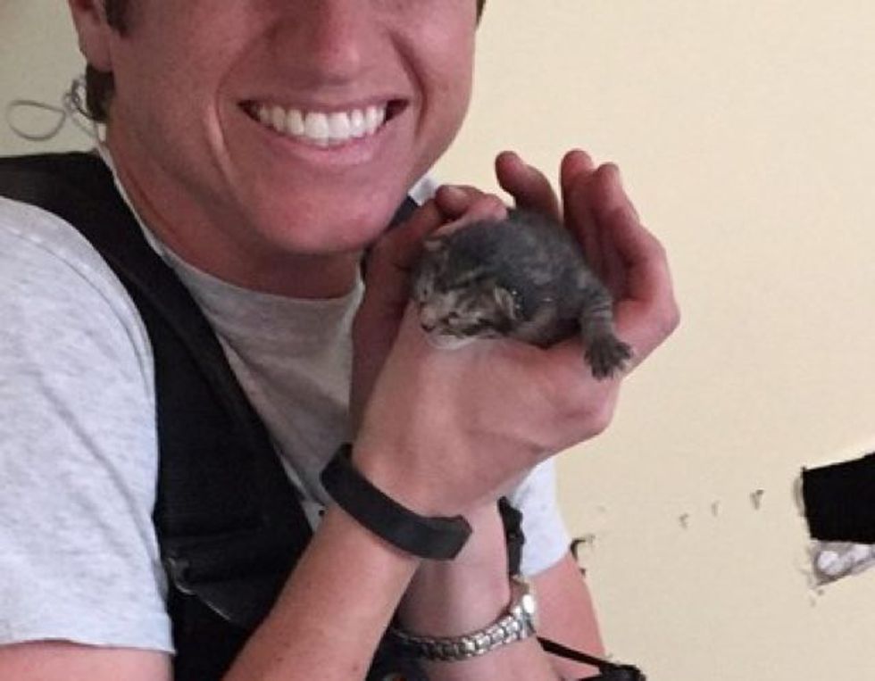 Firefighter Tara Holcomb rescued this little kitten twice. First by saving him from being trapped in a wall...