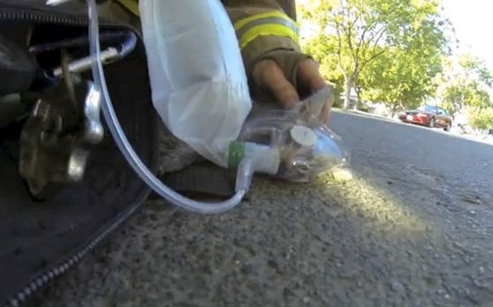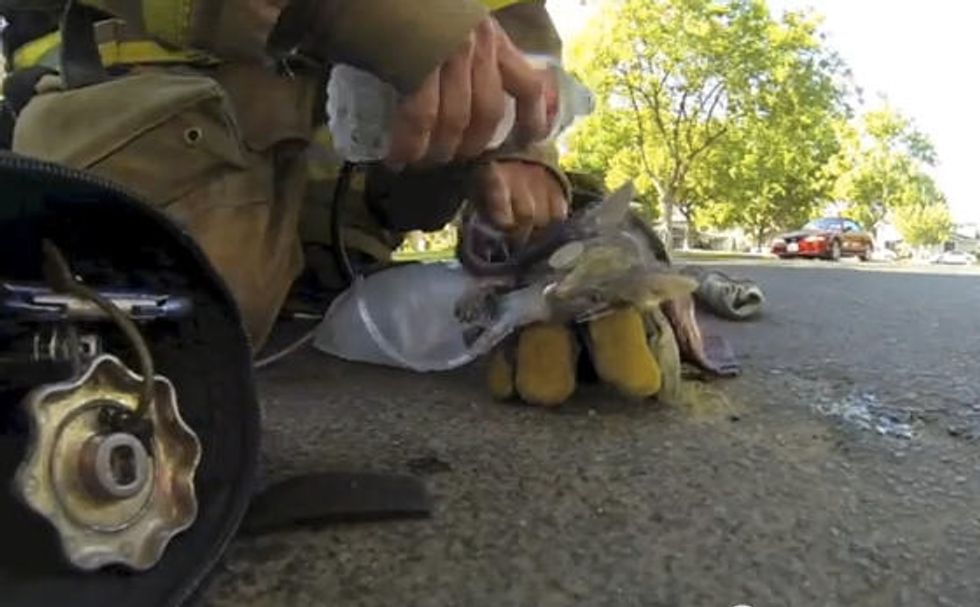 Firefighter placed the kitten on his glove to prevent hot asphalt while giving the kitty oxygen through a mask.