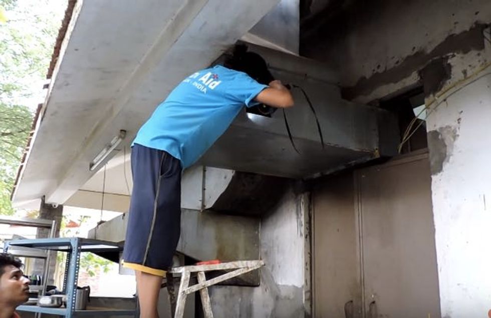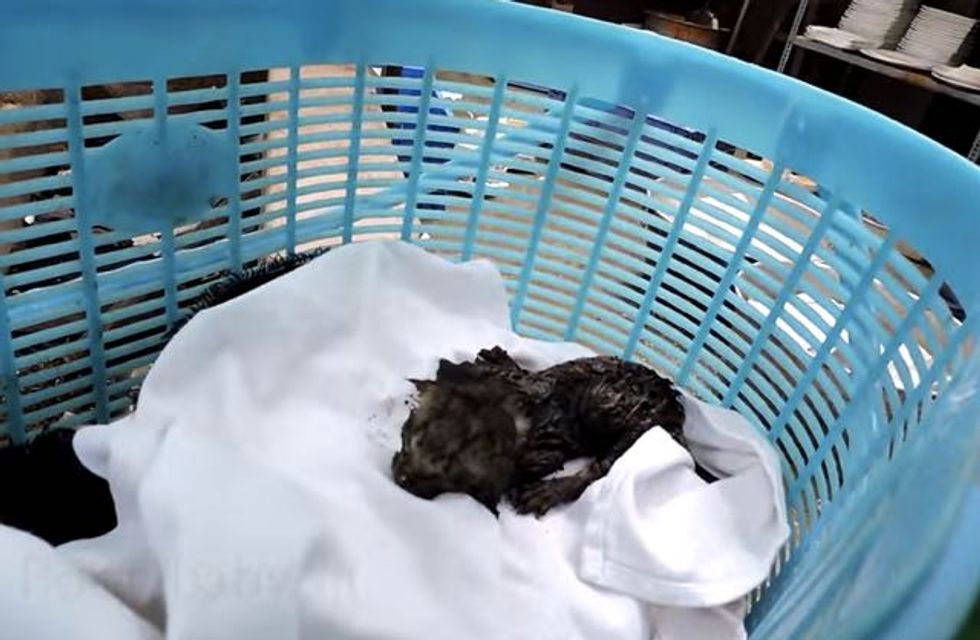 After the rescuers arrived, they located the kittens and cut open the pipe with help from the restaurant owners. They safely retrieved five tiny dirty kittens where one of them was completely covered in grease.