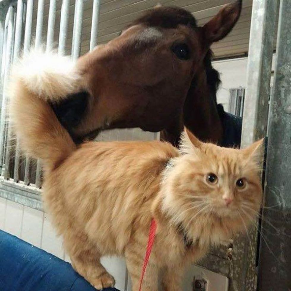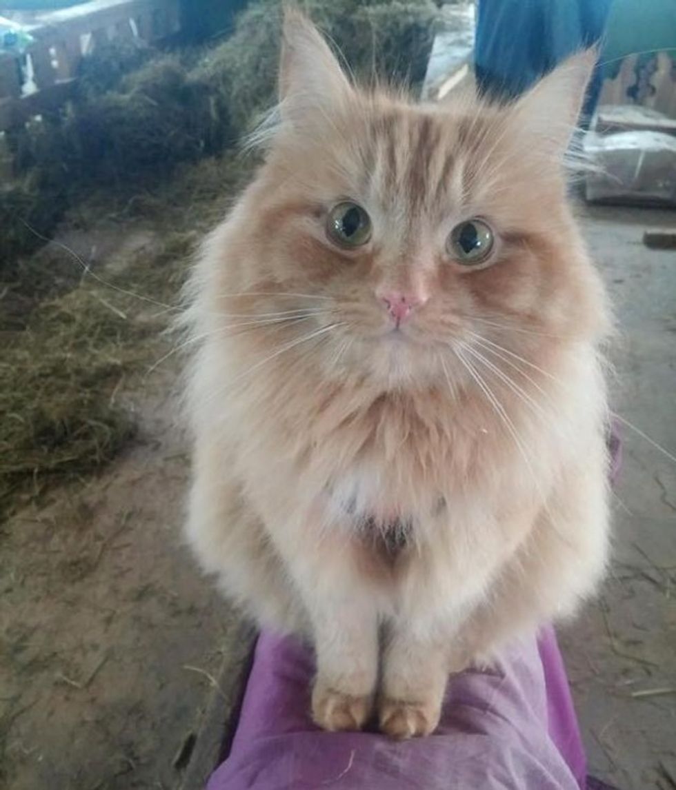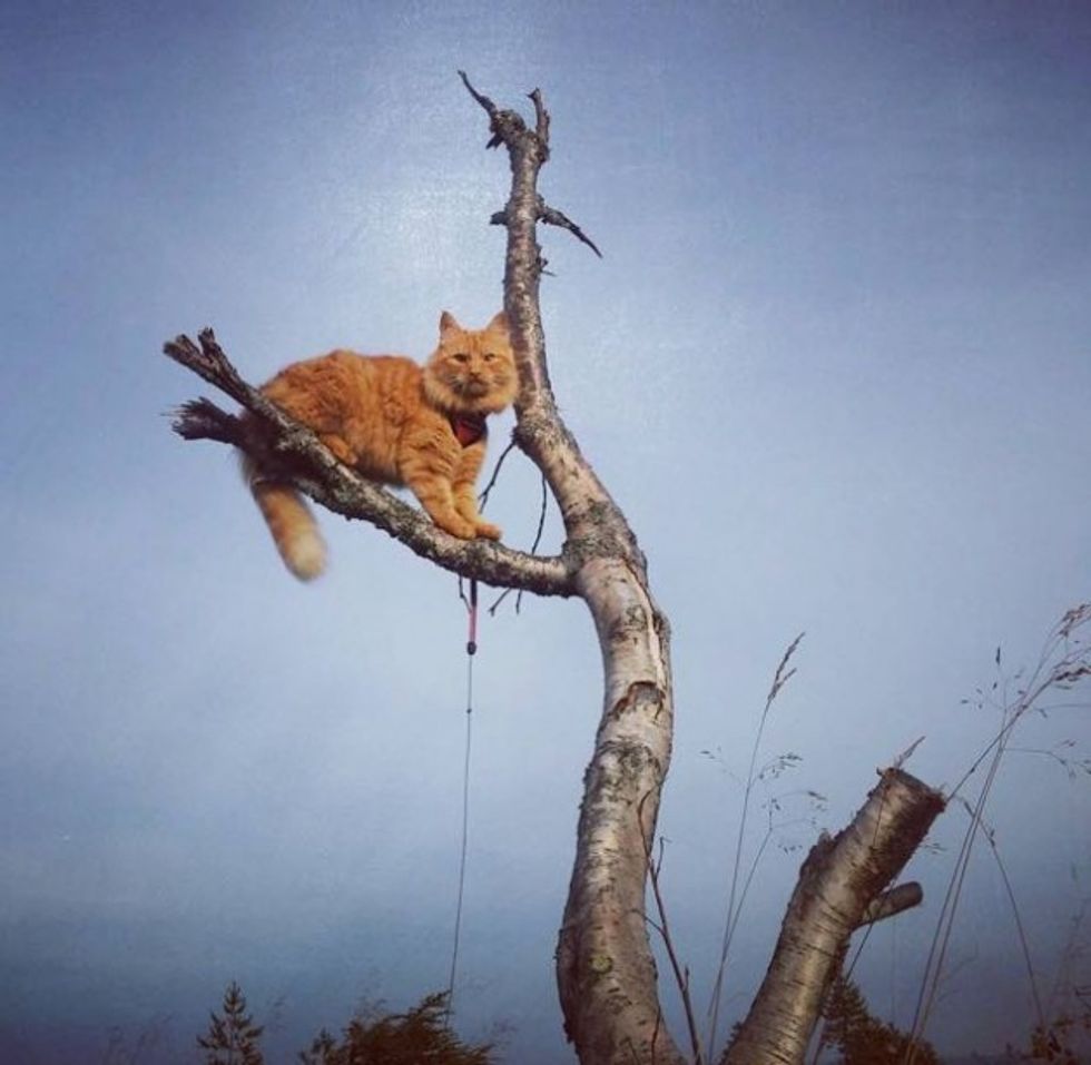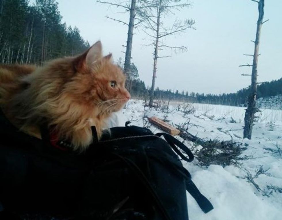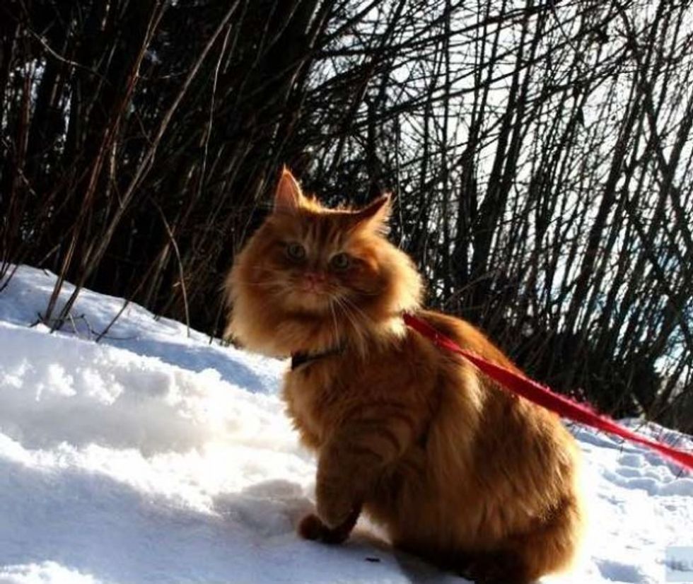 The fluffy ginger boy behaves almost like a dog, and loves hiking and skiing with his human mom.