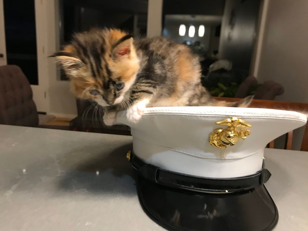 The curious calico climbed on top of her foster dad's Marine dress hat, giving it a proper inspection.