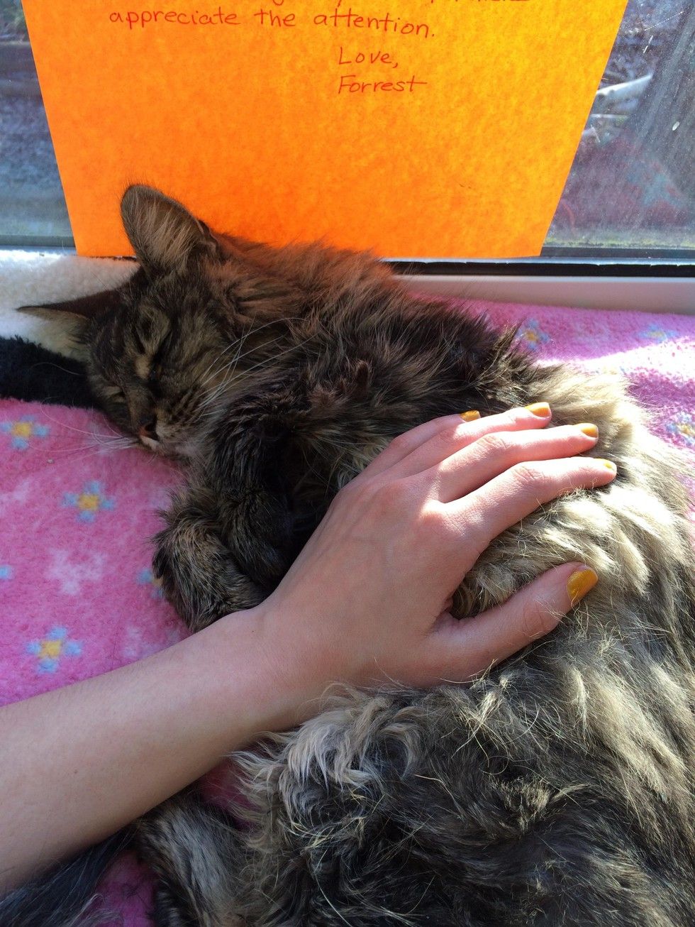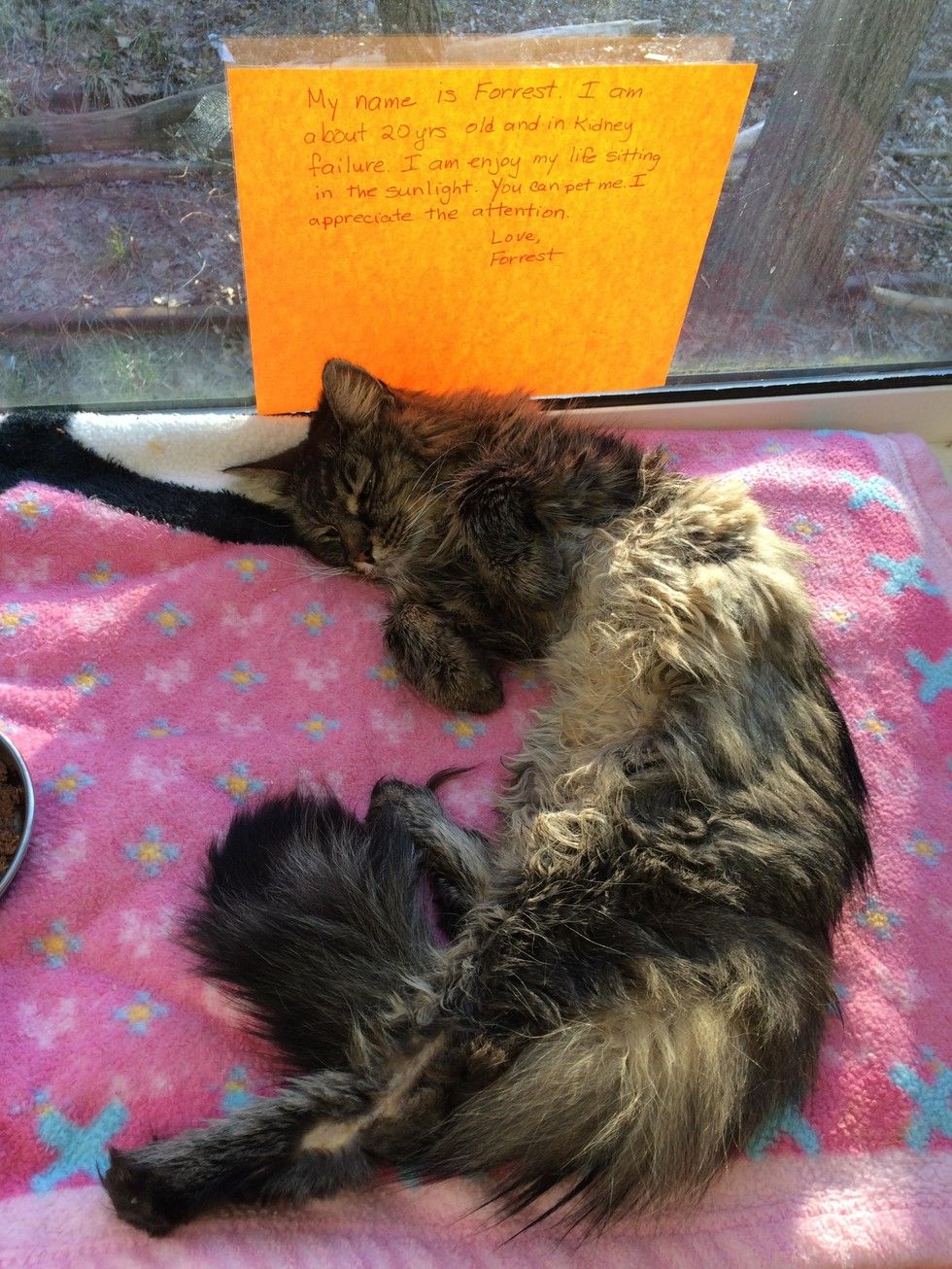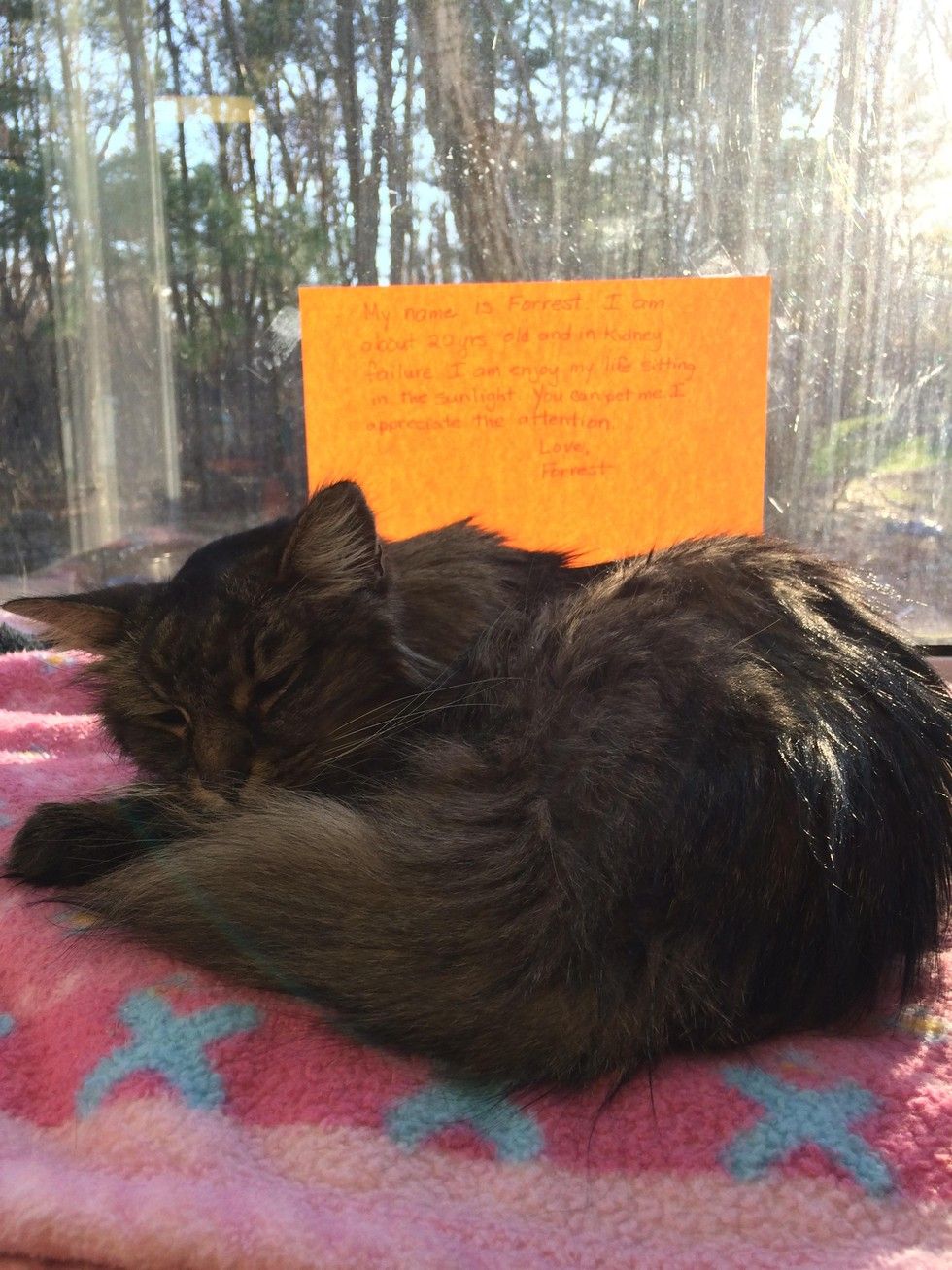 "My name is Forrest. I am about 20 yrs old and in kidney failure. I am enjoy my life sitting in the sunlight. You can pet me. I appreciate the attention. - Love Forrest."