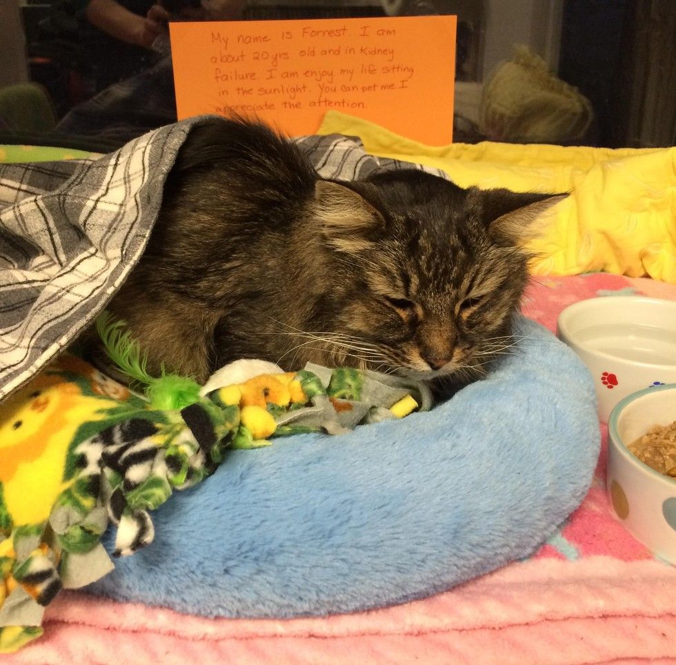 Forrest is 20 years old. He's spending his retirement in this sunny window at the shelter, enjoying the sunlight while getting pets and attention from volunteers.