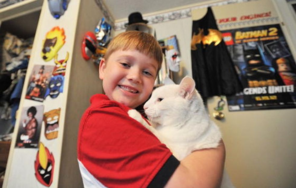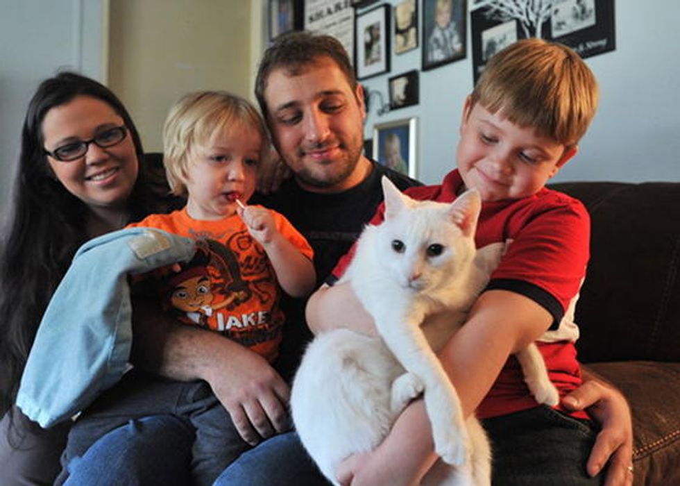 Brendon fell in love with the white cat and begged for him to stay. The family then brought him into their foster home, but what they didn't know was that Mr. Meowy returned their kindness by saving their home.