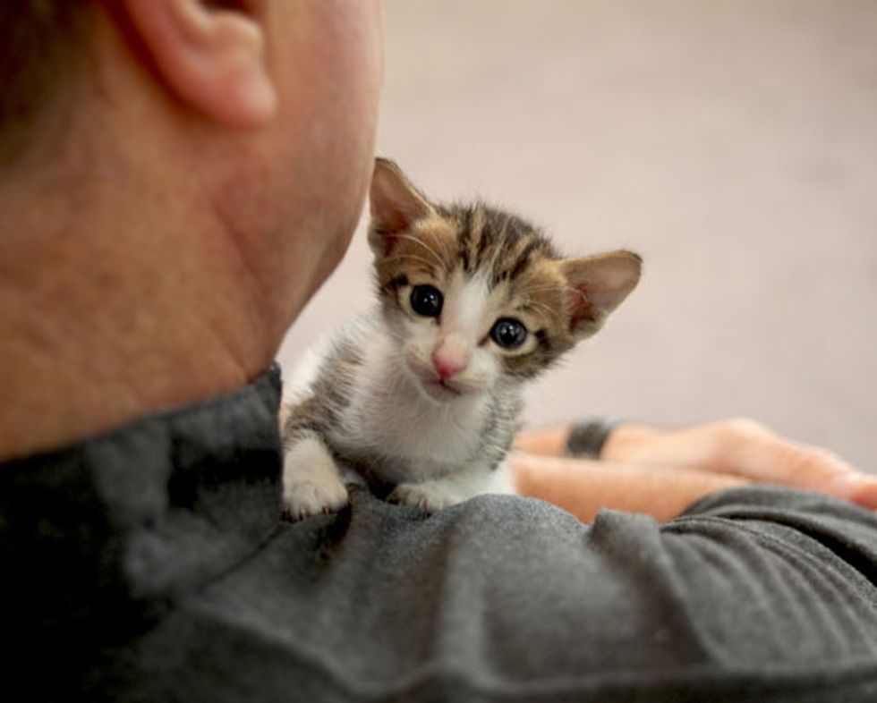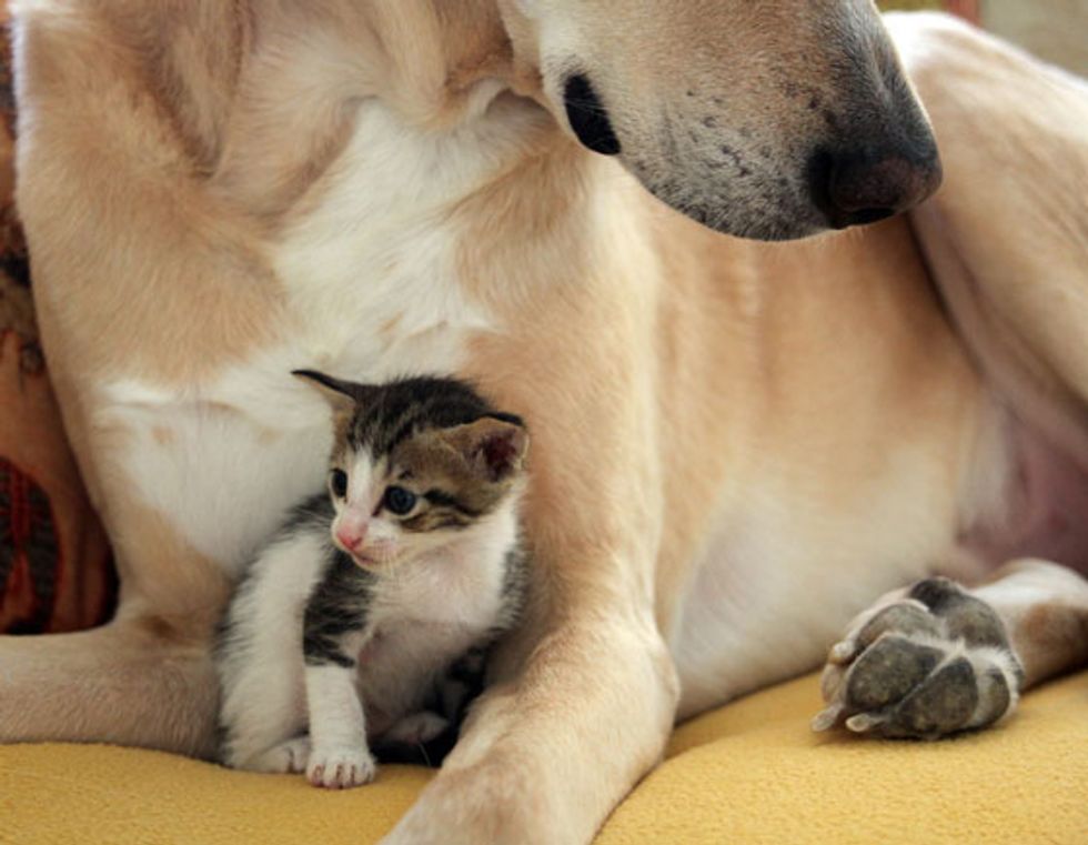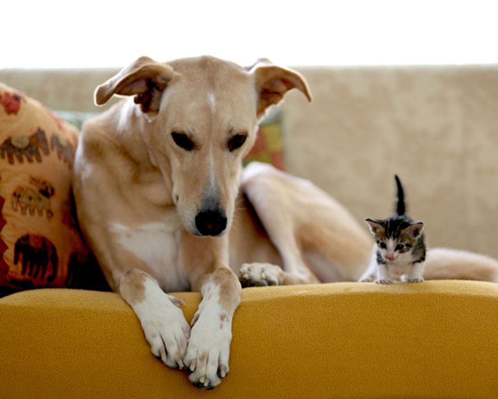 A tiny kitten found a big companion to share the sofa with in his foster home. He is loving his big doggie friend, and often plays with his tail and gives him occasional love nips. The dog named Hoss does not mind any of his antics. In fact, Hoss was formally feral himself according to his owner Patty P. "He now loves and is very protective of (his kittens)." The little foster kitten came from a similar background as Hoss, both needed a home and now they are living under the same roof. The little kitten is eager for love and comfort, and Hoss has a big heart for those kitties in need. They are often seen snuggling up together on the sofa, keeping each other company.