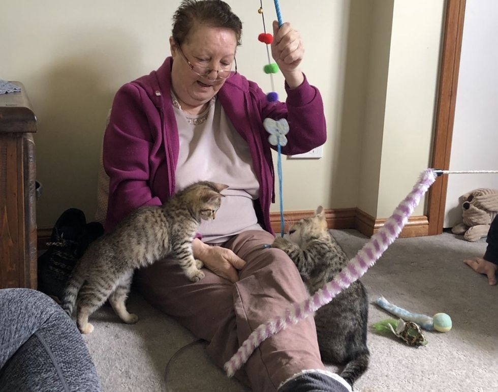 The kittens were running around the room, playing with toys and hopping onto Kathy's lap, bestowing on her some kitten love. They offered some cuddles and filled the room with their rumbling purrs.
