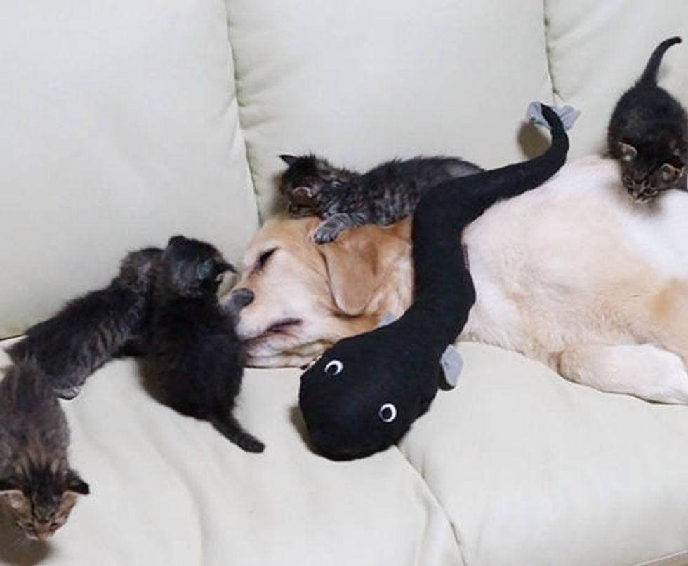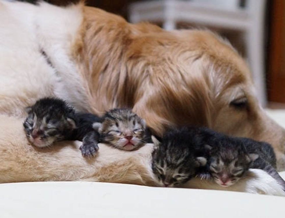 When these tiny foster kittens came to their new home, they were welcomed by Ponzu the Golden Retriever. The kitties think he's their new dad.