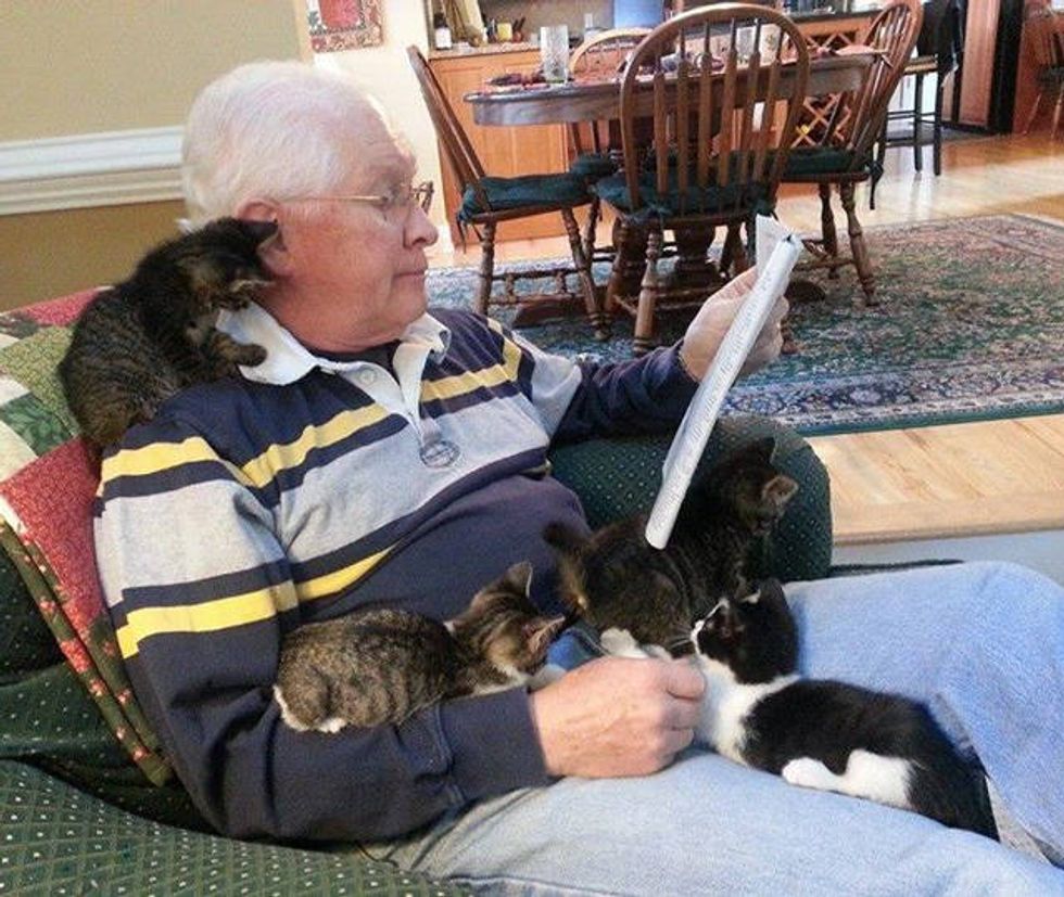 Rebecca Kerins wrote: "I foster for BARCS and brought a litter of kittens with me up to my parents' place for Thanksgiving (AND Christmas). Here's my dad covered in kittens on Thanksgiving (teaching them to read, maybe?) -- to me, he's the original softie, and I developed my enormous love of animals thanks in large part to his influence!"