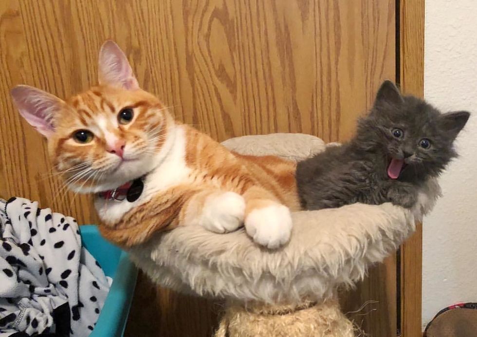 The kittens met their foster dad, Otis the resident cat, and they immediately nuzzled in for a cuddle.