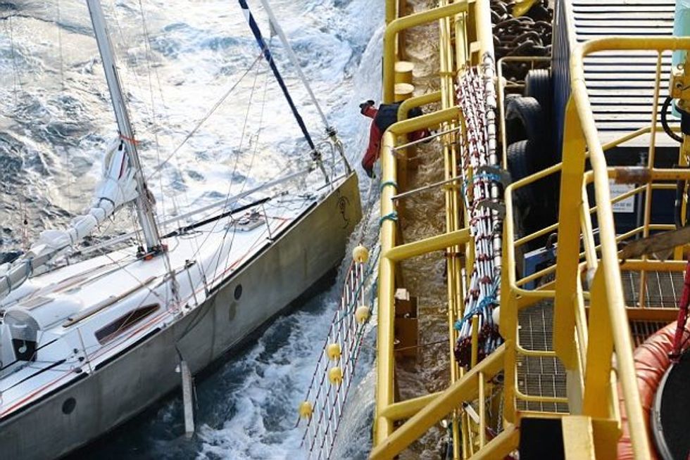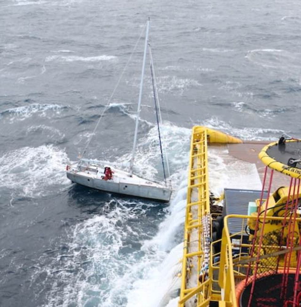 A French sailor tucked his cat under his coat before leaping onto a rescue ship from his yacht. According to the Coast Guards, he was protecting the cat in his coat as he jumped over to the waiting rescue ship.