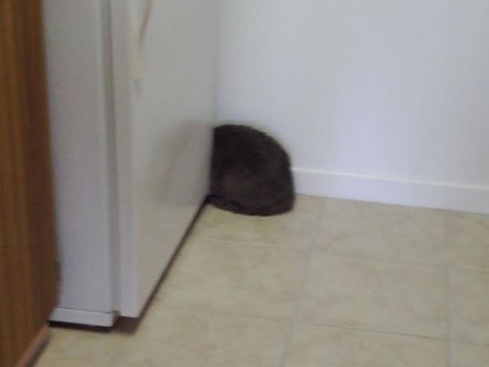 "The first few weeks of being in my apartment, he did nothing but hide during the day and cry at night... he felt that as long as he was hiding his head (and couldn't see me), then I could not see him. I didn't want to ruin it for him, so I pretended not to notice him when he had his head stuck in a corner somewhere."