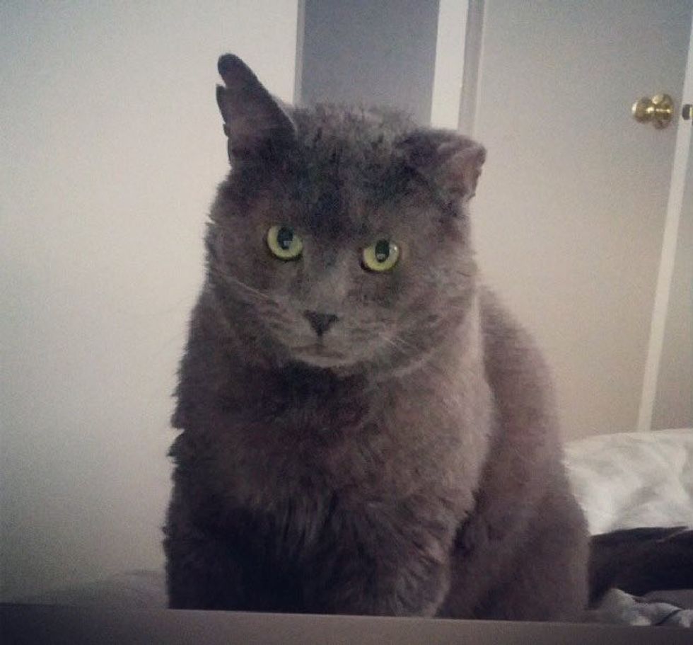 Walter's human wrote: "This is Walter on the day I adopted him. A few weeks prior, he was found on the streets covered in wounds, gashes, and burns all across his chest. The tips of his ears were gone, likely due to frostbite, and one ear had a perfectly symmetrical hole punched into it, which causes the ear to droop. He responded to any human contact by cowering and shaking uncontrollably." (imgur)