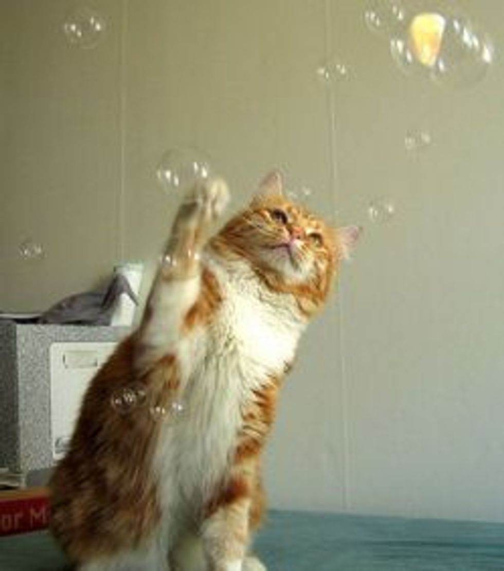 3. Bubbles – Buy a bottle of bubble solution and blow them around indoors or outside. Attempting to catch and pop all the bubbles will keep your cat occupied.