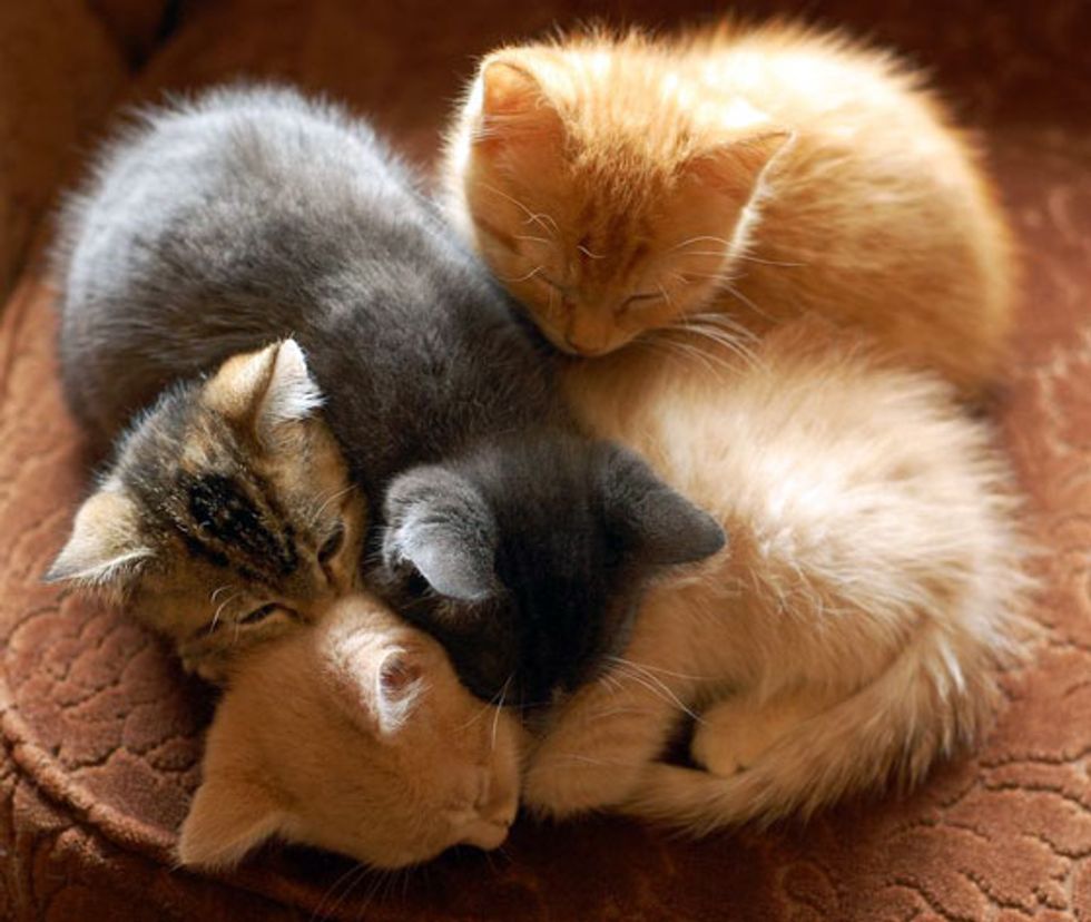 As soon as one kitten starts lying on the other kitty, the rest follow suit. It's a furry purry pile.