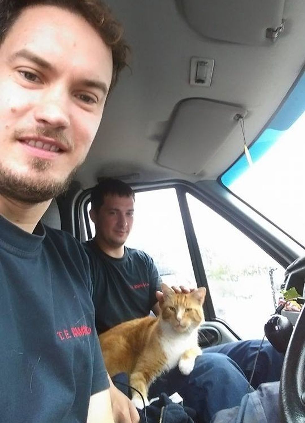 "Garfield hopped in the van yesterday morning to get out of the rain, clearly wanted to help with the new petrol station.. Such a friendly cat," said Aaron Cowan.