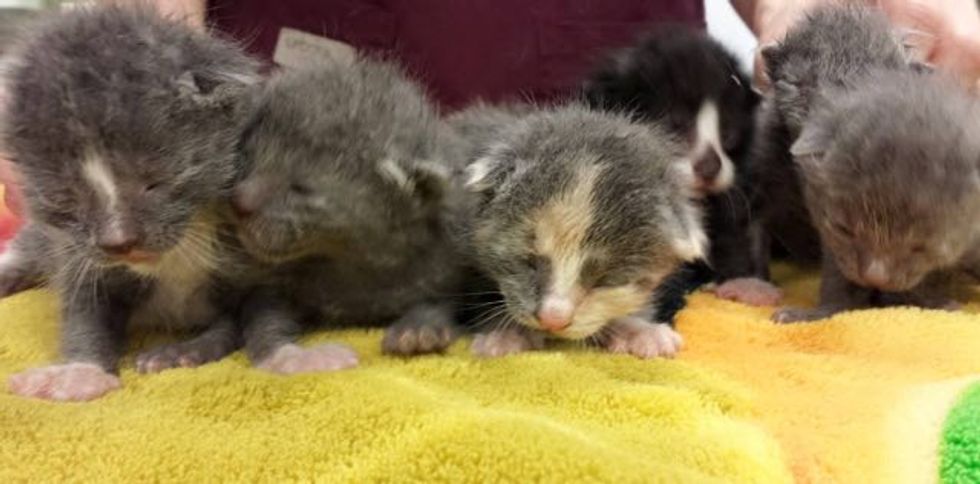 Six 8-day-old kittens were abandoned outside a Walmart store. A good Samaritan took the babies to the Indian Land Animal Hospital. Here they are! Eyes are not opened yet!