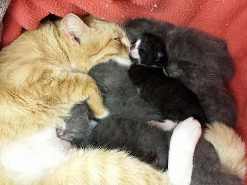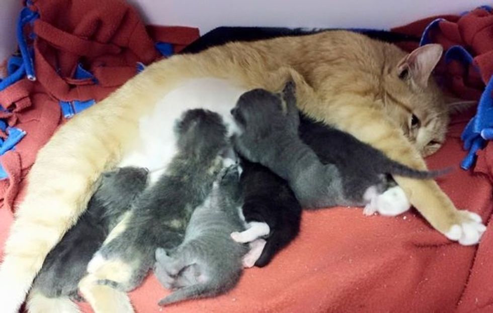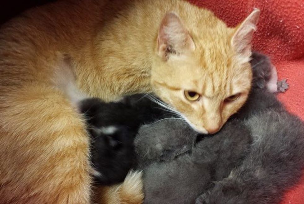 At the same time, they had a ginger momma cat, Sandrine, who just lost her babies, so they placed the litter with the mama, hoping she would nurse them. She took to them right away!