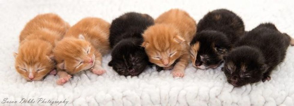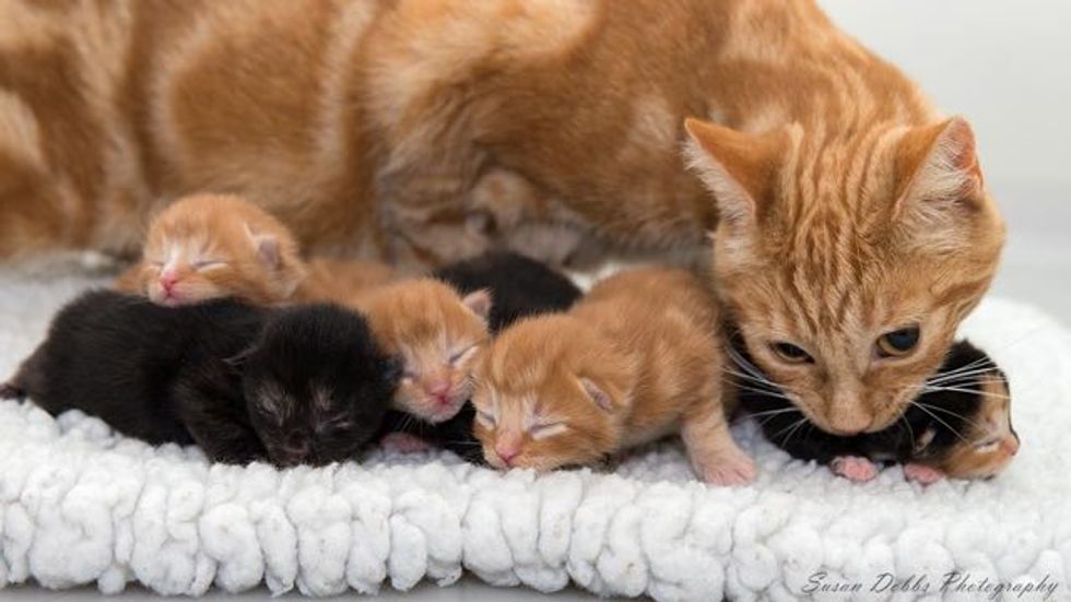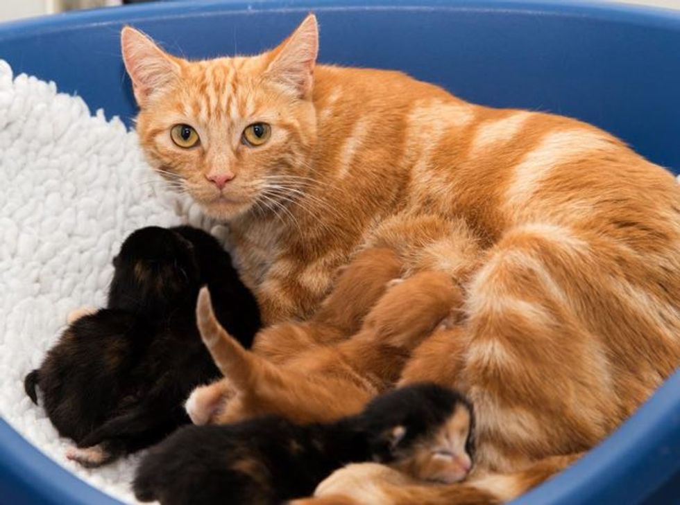 The sweet momma gave birth to three rambunctious ginger boys and three adorable tortie girls.