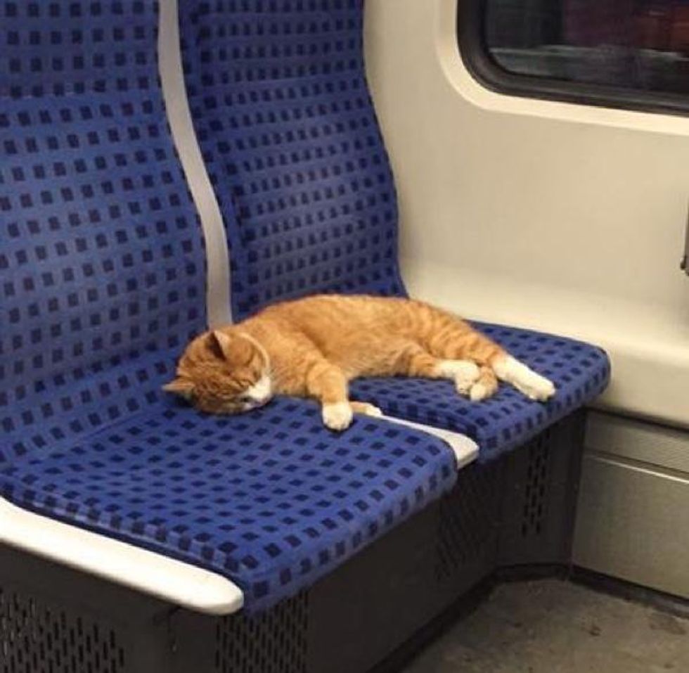 A feline passenger had taken up two seats lying blissfully for a cat nap on the train.