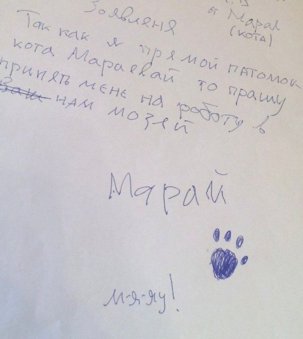 "Application. As I am a direct relative of [Anna] Maraeva, I ask you to give me a job in your museum. Maray the Cat."