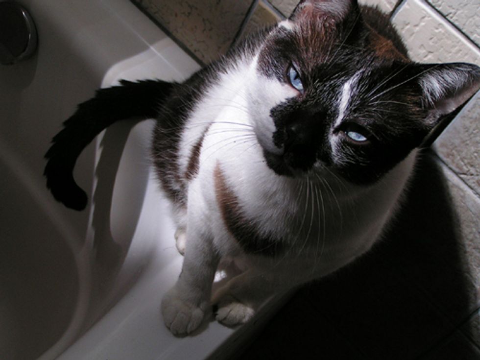"He loves to go to the bathroom with me. Whenever someone is in the shower, he's there. He loves the bathtub so much that I have to take him out of it when I am going to use it. He also loves to drink fresh water and demands it." Goku likes his litter box to be as clean as new. "If his litter box isn't clean enough for him, he will surely let you know. Sometimes I have to clean it before and after he uses it."