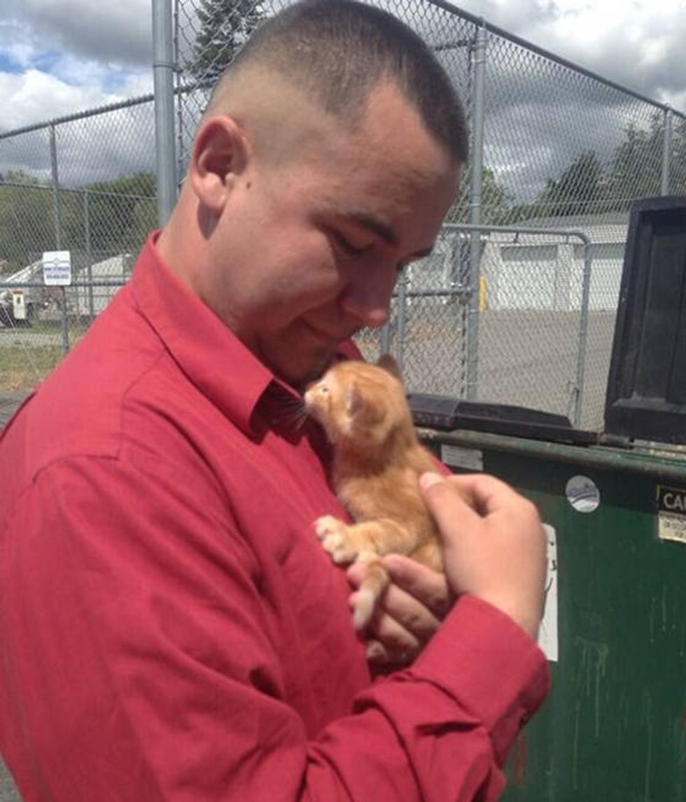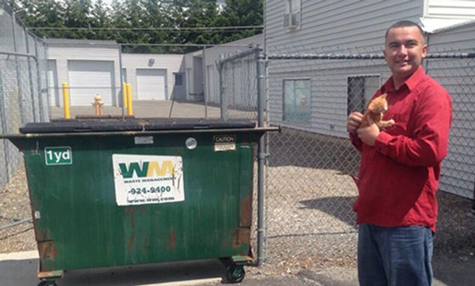 Taylor McLucas heard a kitten crying from inside a dumpster, climbed in and saved her.