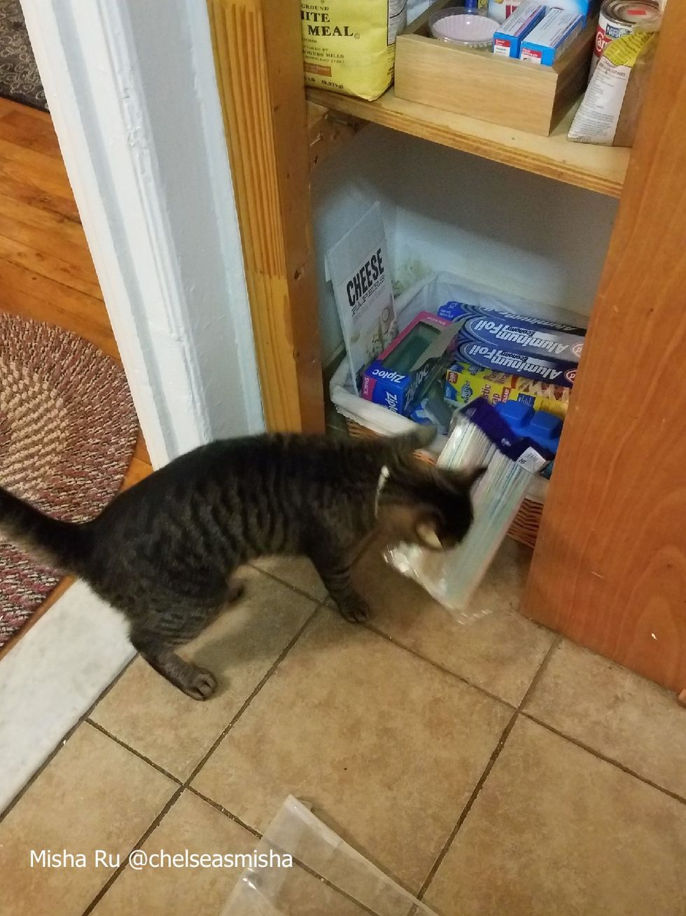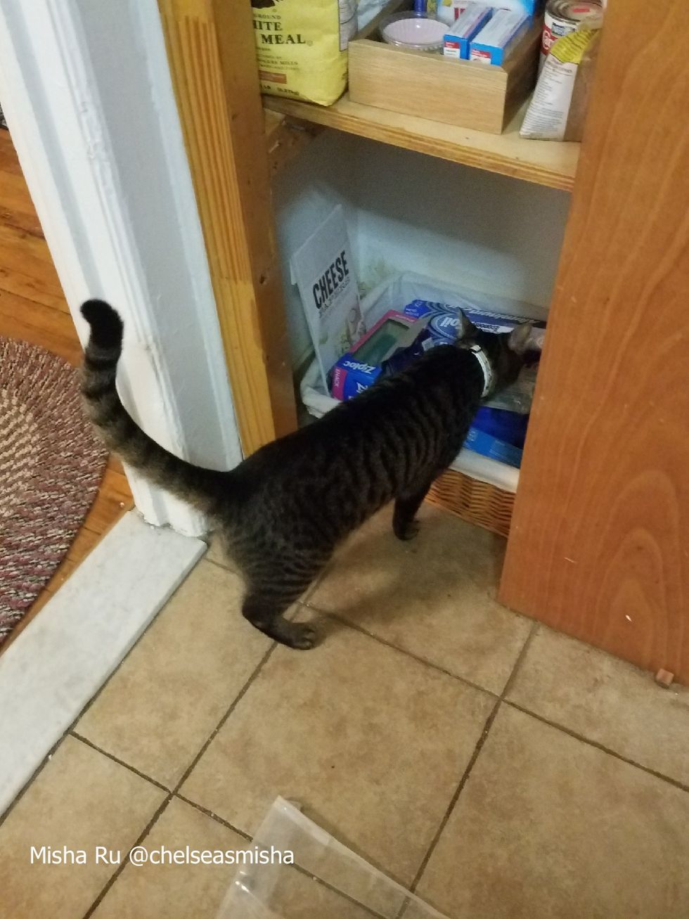 Misha is quite the character. He likes to treasure hunt in the kitchen and bring various items (prizes) to his humans to show off his hunting prowess.