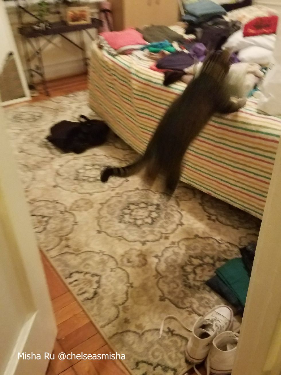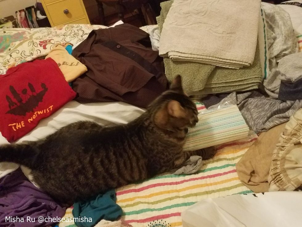 Once Misha settled onto the bed, he laid down his "prey" neatly on top of some fresh laundry.