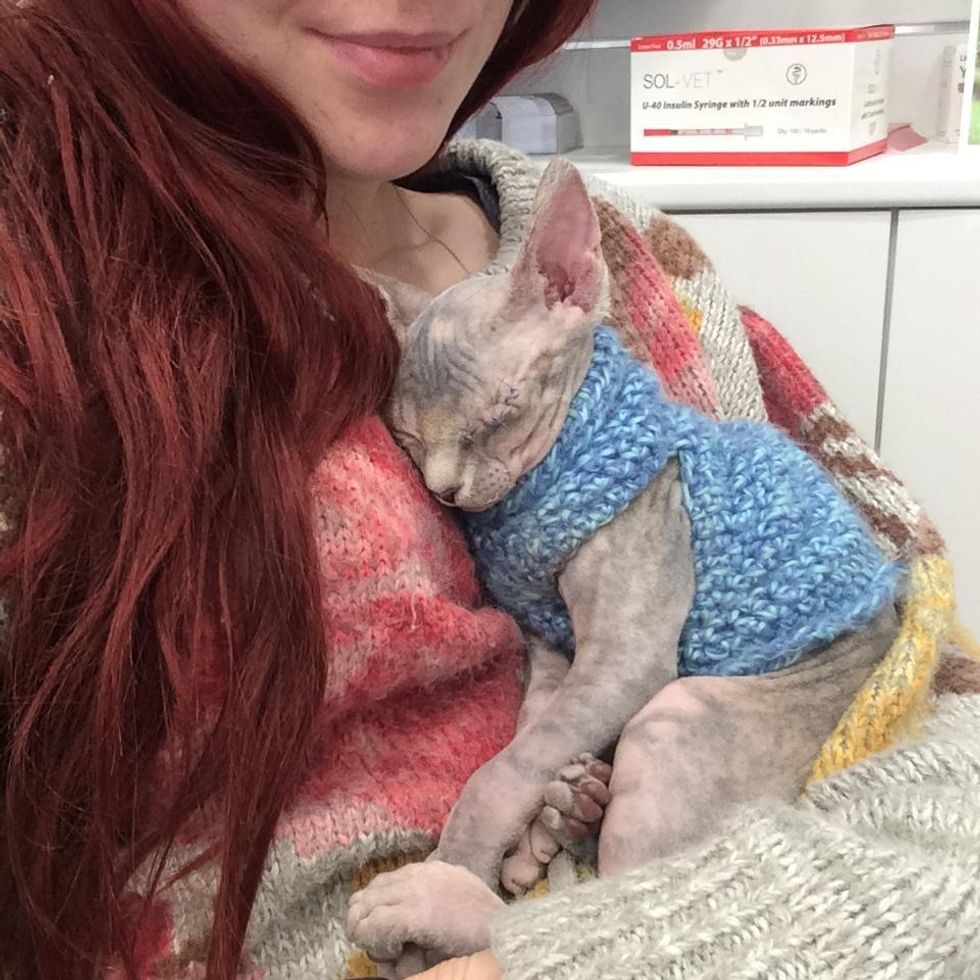 Stitch was given a tiny sweater to keep warm. It made her a very happy kitty and she just kept purring in her caregiver's lap, showing a lot of gratitude to everyone at the clinic.