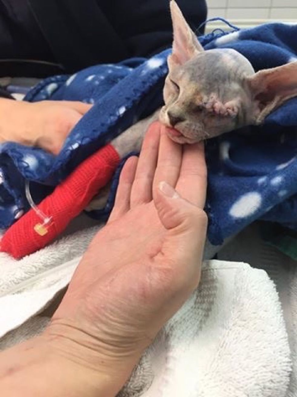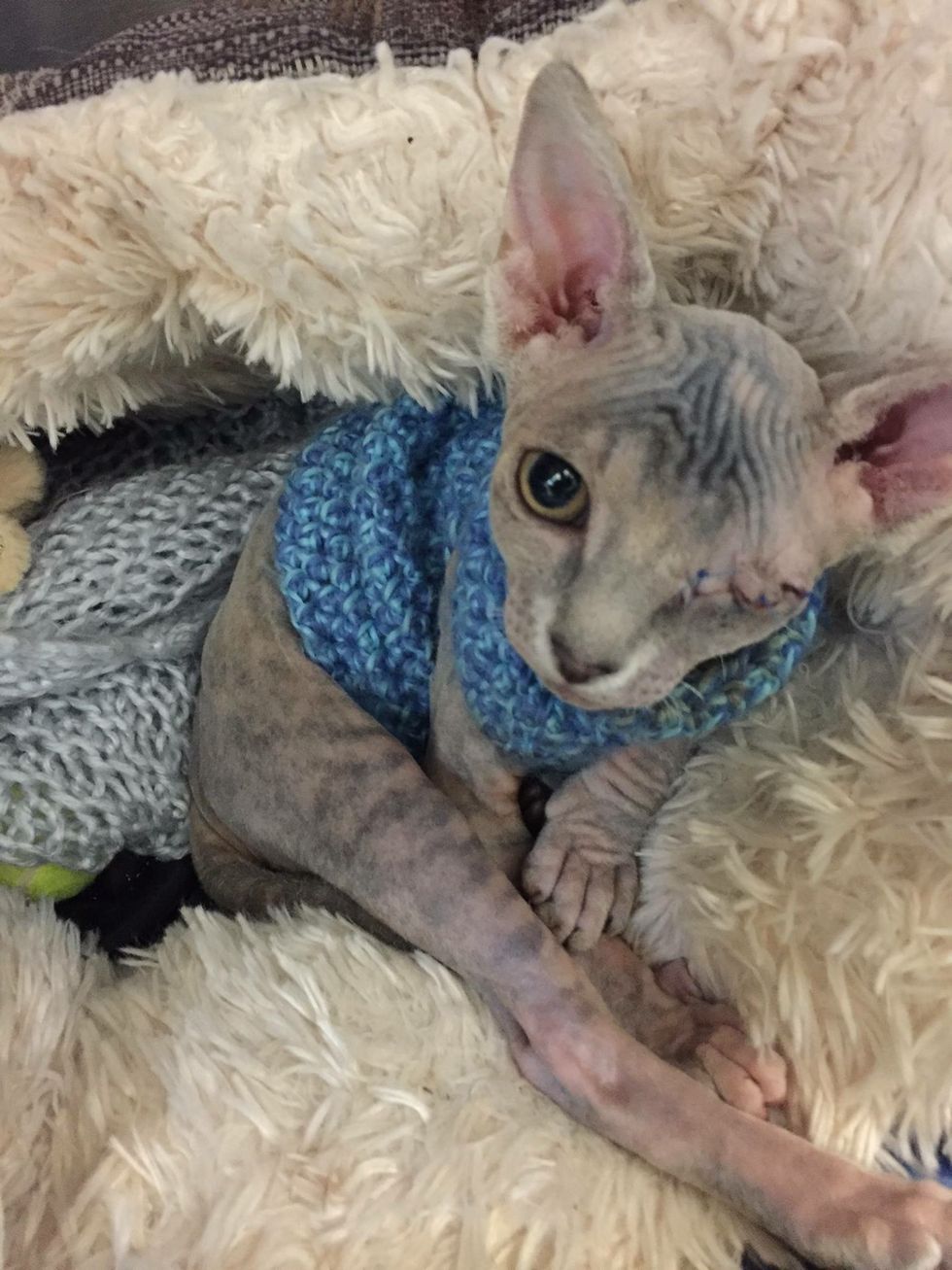 Stitch came to a vet clinic with a wounded eye. The little Sphynx was in need of a lot of help.