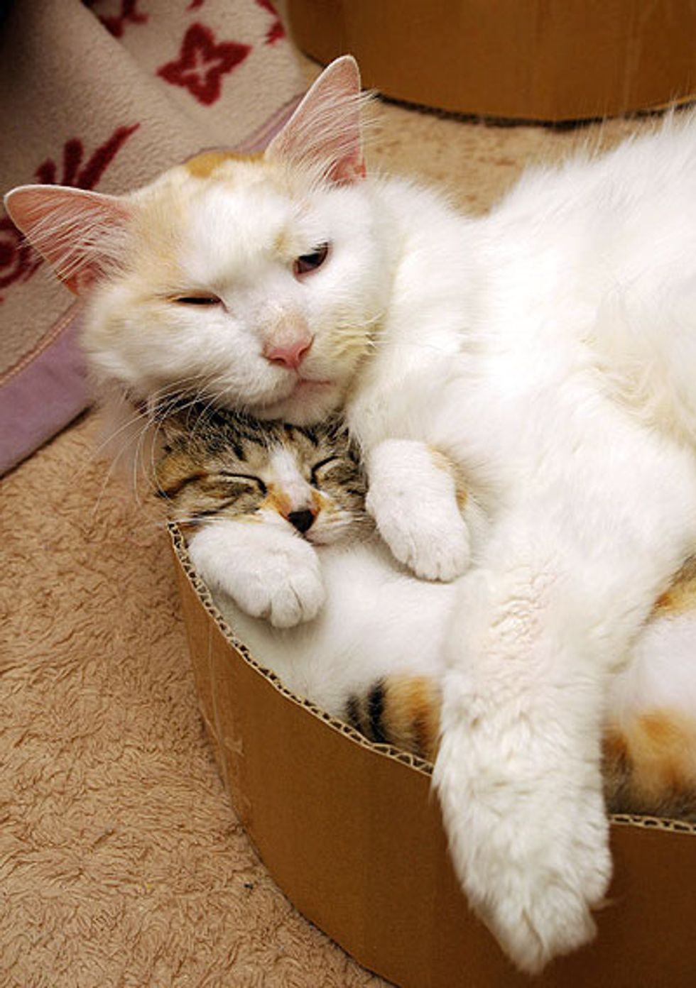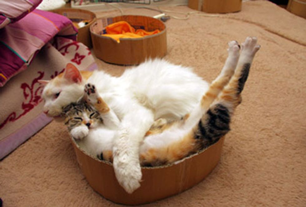 Castella the calico is confined in a cat bed by a hug from Okaki, her brother from a different mother. They have been hugging each other since day one.
