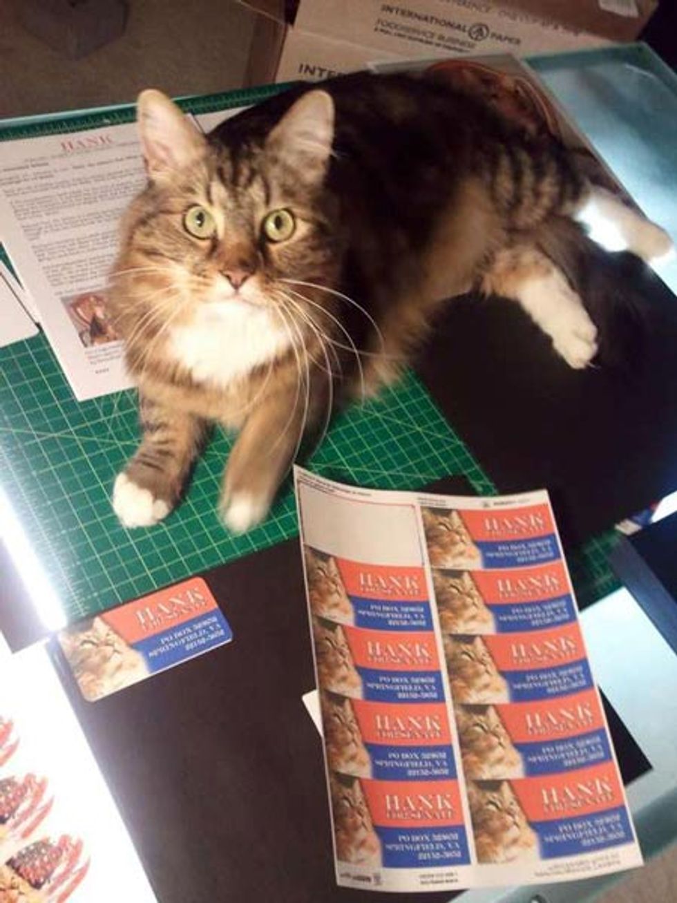 As a feline candidate, Hank is advanced in technology. He has his own Facebook and twitter accounts and a website for his campaign. He's also made a promotional video for his running.
