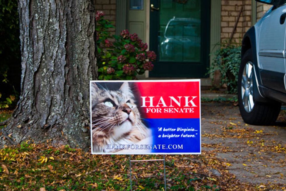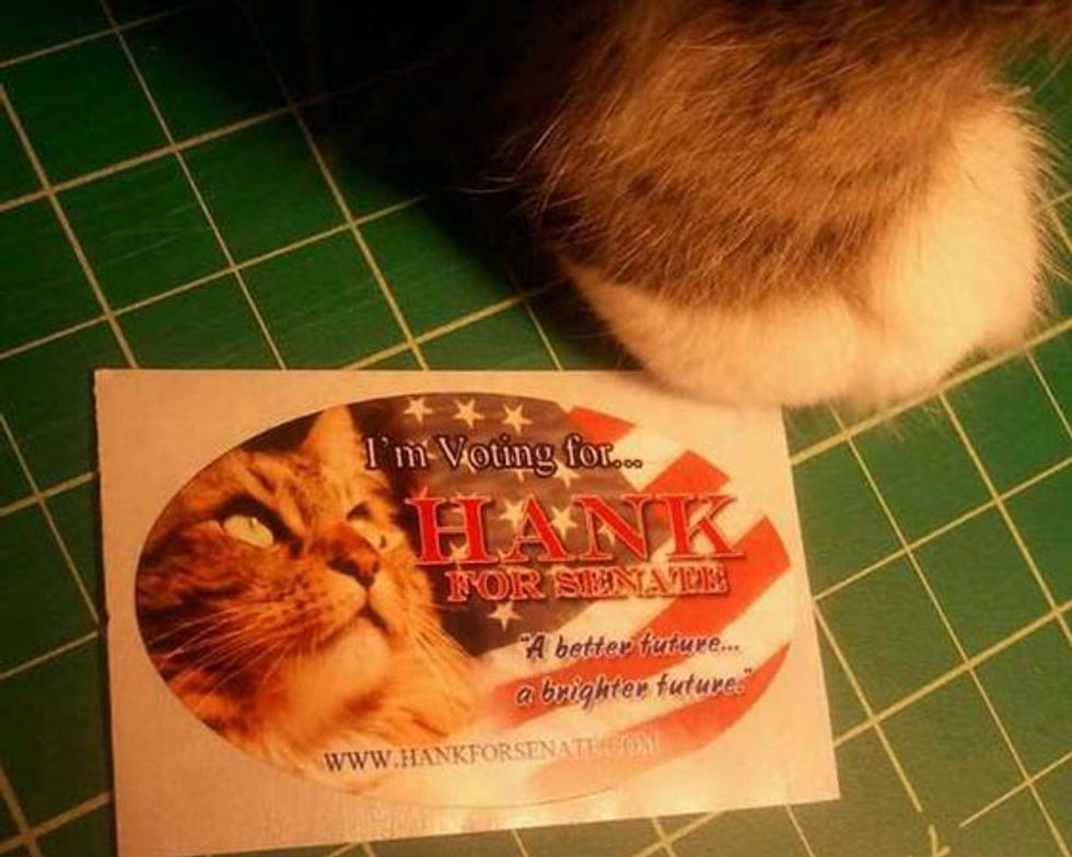 Who says cats can't be politicans? A 4-legged feline named Hank has recently anounced his running for a Senate seat being vacated by Virginia Democrat Jim Webb. It's offical that this purr-fect candidate is now up against two human politicans and some think "the fact that he is an outside the beltway cat could be an advantage."