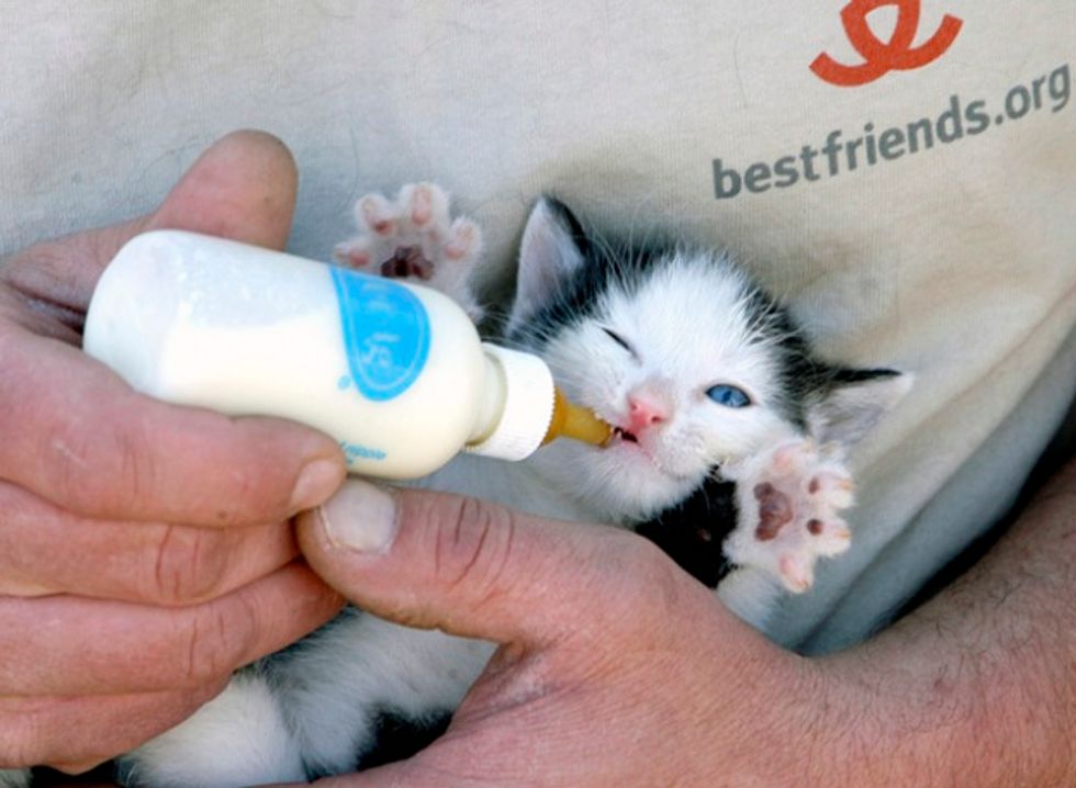 This itty bitty rescue kitten was taken in by the wonderful people from Best Friends Animal Society. Troy Snow a photographer for Best Friends took this adorable photo of the little one while the volunteer was trying to bottle feed the kitten. Apparently, the kitten was aware of the camera and gave it her best pose :). It's priceless!