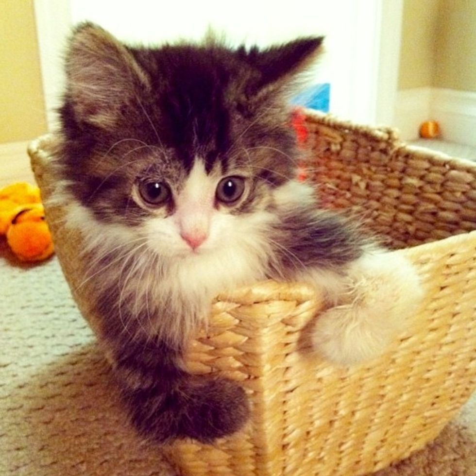 "A baby photo of little Pip the day I rescued him! That basket helped him sit upright despite his arms and he slept in it until he physically couldn't fit anymore."