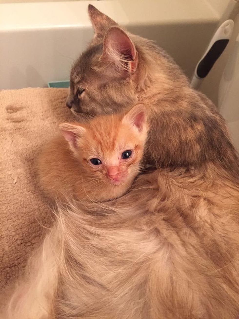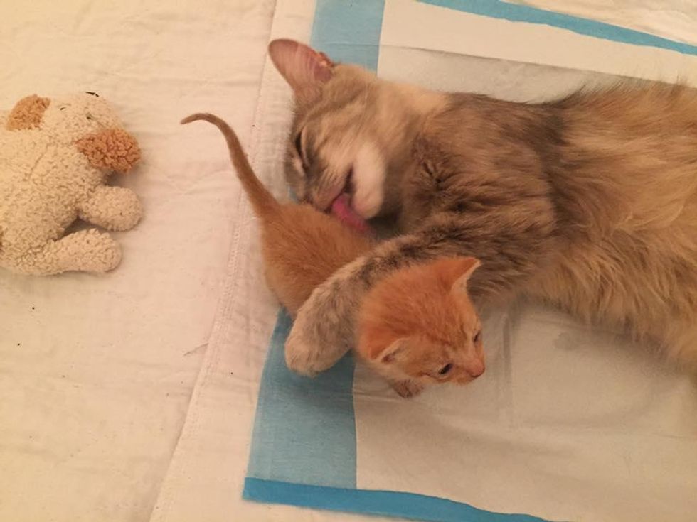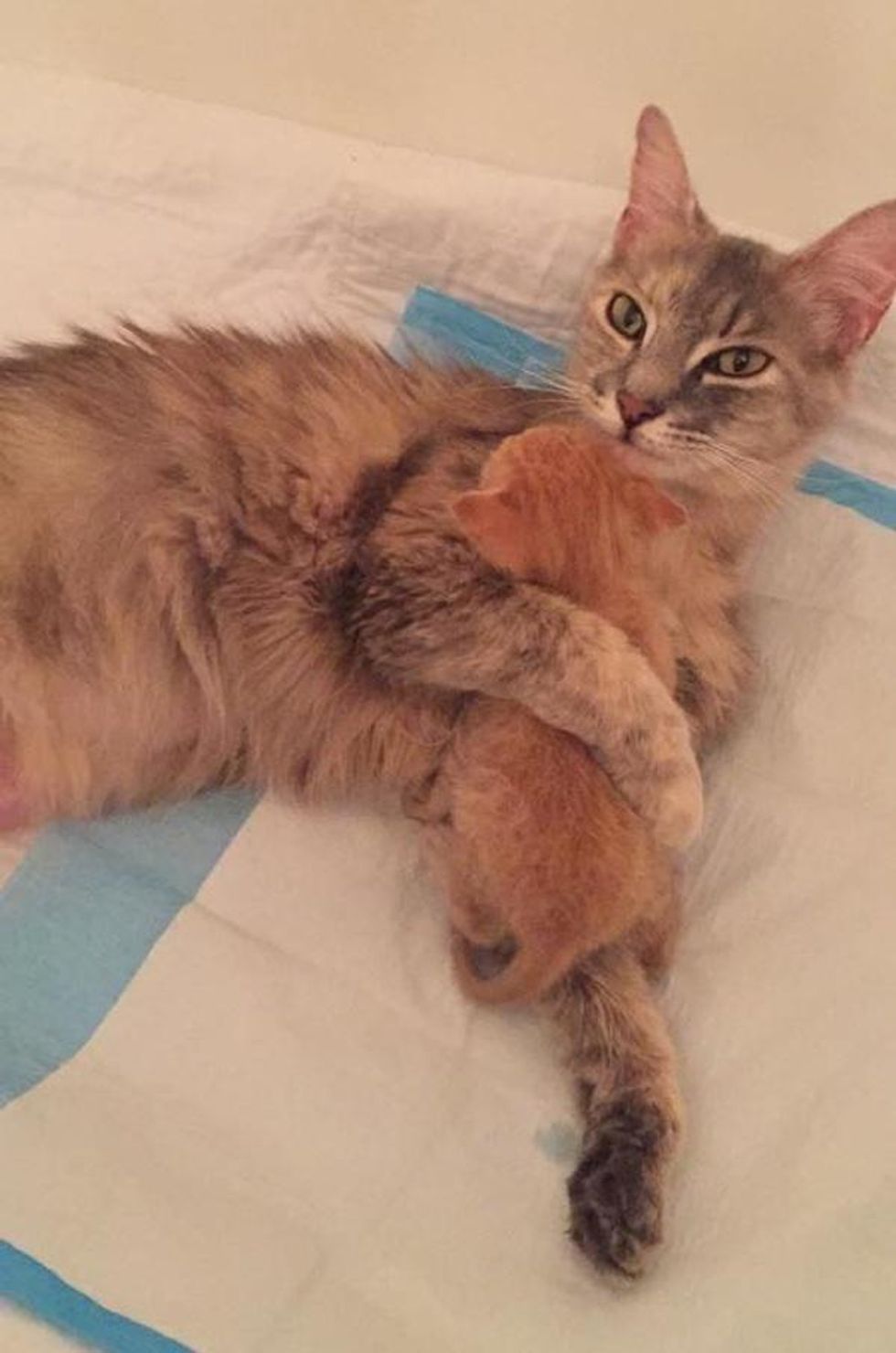 "When Mama Ember first saw Flame, you could tell she was immediately in love. She started snuggling him, cleaning him, and encouraging him to feed. It was absolutely adorable," Christina Hill of the Atlanta Humane Society told Love Meow.