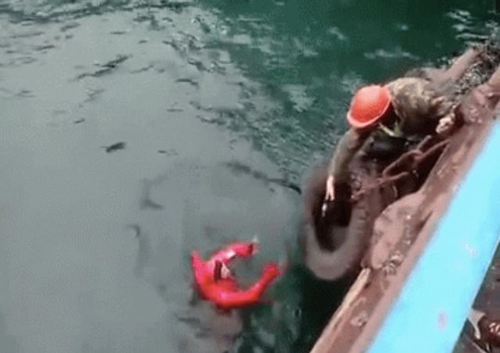 This heroic man jumped in icy water to rescue a cat that was stuck in a cargo boat.