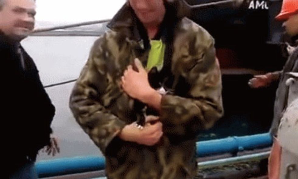 Port dockers joined this courageous rescue and helped retrieve the black and white kitty to safety and warmth. This man reassured the frightened cat after this big scare by holding him tightly in his jacket.